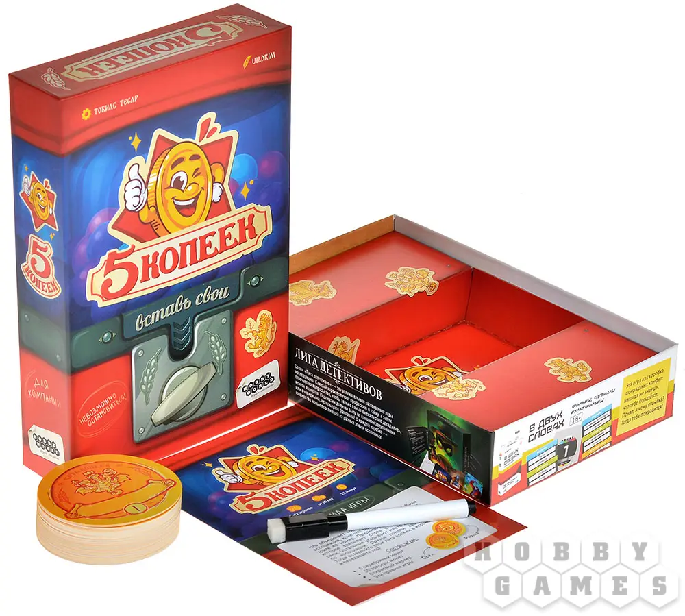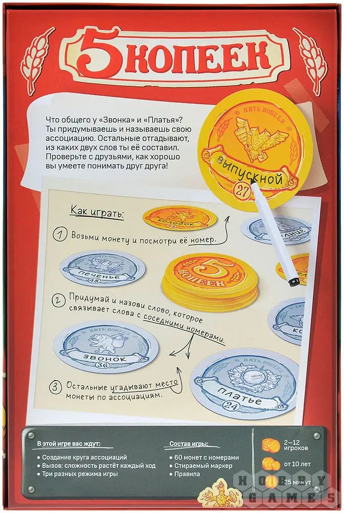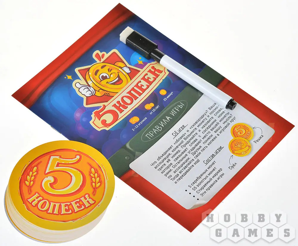 "5 копеек" – это настольная игра для компании от двух до двенадцати человек, где главное – ассоциации и умение читать мысли. В основе лежит простая механика: игрок берёт монету с номером, придумывает слово, связывающее два соседних слова в круге, а остальные пытаются угадать, между какими монетами должна лежать новая. Уникальность игры в её динамике: с каждым ходом круг растёт, а задача становится сложнее. Вы можете играть в классическом режиме, "До первой ошибки", или в командном варианте (от четырёх участников).