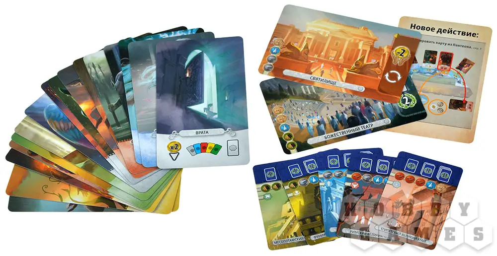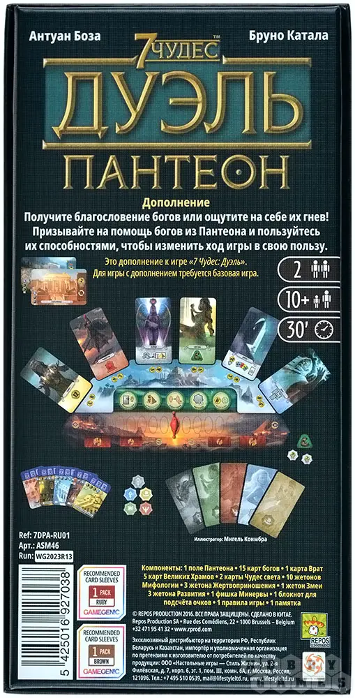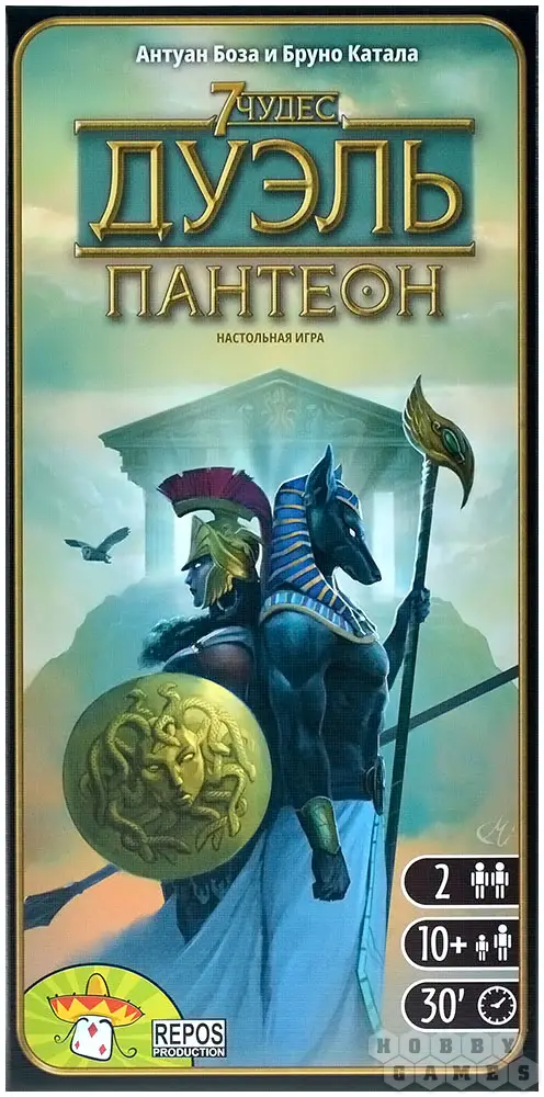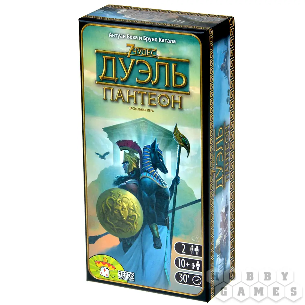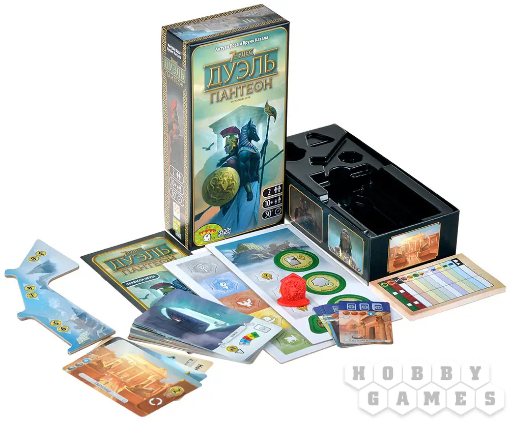 Дополнение "Пантеон" привносит в игру "7 чудес: Дуэль" самых настоящих богов, чья могущественная воля способна дать вам неоспоримое преимущество или низвергнуть вашу цивилизацию до песчинок. Игроки выбирают карты божеств в Эпоху I, чтобы в дальнейших Эпохах воспользоваться их преимуществами. Божества относятся к одной из пяти Мифологий, которые, в свою очередь, обладают своей специализацией. Поклонитесь Баалу, чтобы забрать у соперника одну из его построенных коричневых карт. Или преподнесите дары Афродите, чтобы сразу получить 9 победных очков. А если вы сторонник грубой силы, то принесите жертву Марсу, чтобы увеличить мощь своей армии на 2 щита!