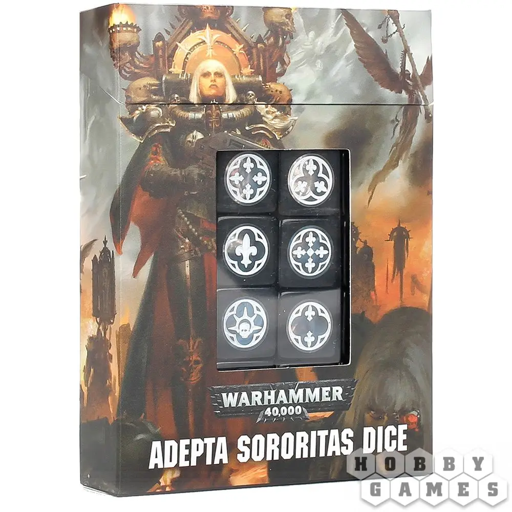 Покажите свою верность идеалам Императора и святым орденам Адепта Сороритас вместе с их особенным набором кубиков. Эти двадцать чёрных кубиков созданы так, чтобы выглядеть, как витражи настоящего храма Империума. Вместо шестёрки на кубиках стоит символ Сестёр Битвы – белая геральдическая лилия "флёр-де-лис", а на месте единицы изображён стилизованный череп. Белые лилии также используются вместо точек или цифр на других гранях, по две, три, четыре и пять соответственно. Грани кубиков равны четырнадцати миллиметрам.