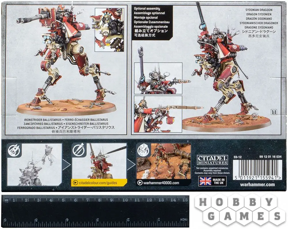 Этот детализированный набор состоит из восьмидесяти пластиковых деталей, необходимых для создания одной модели Железного Странника или Сидонского Драгуна, а также лист с декалями Адептус Механикус и овальную подставку размером 105x70 мм.