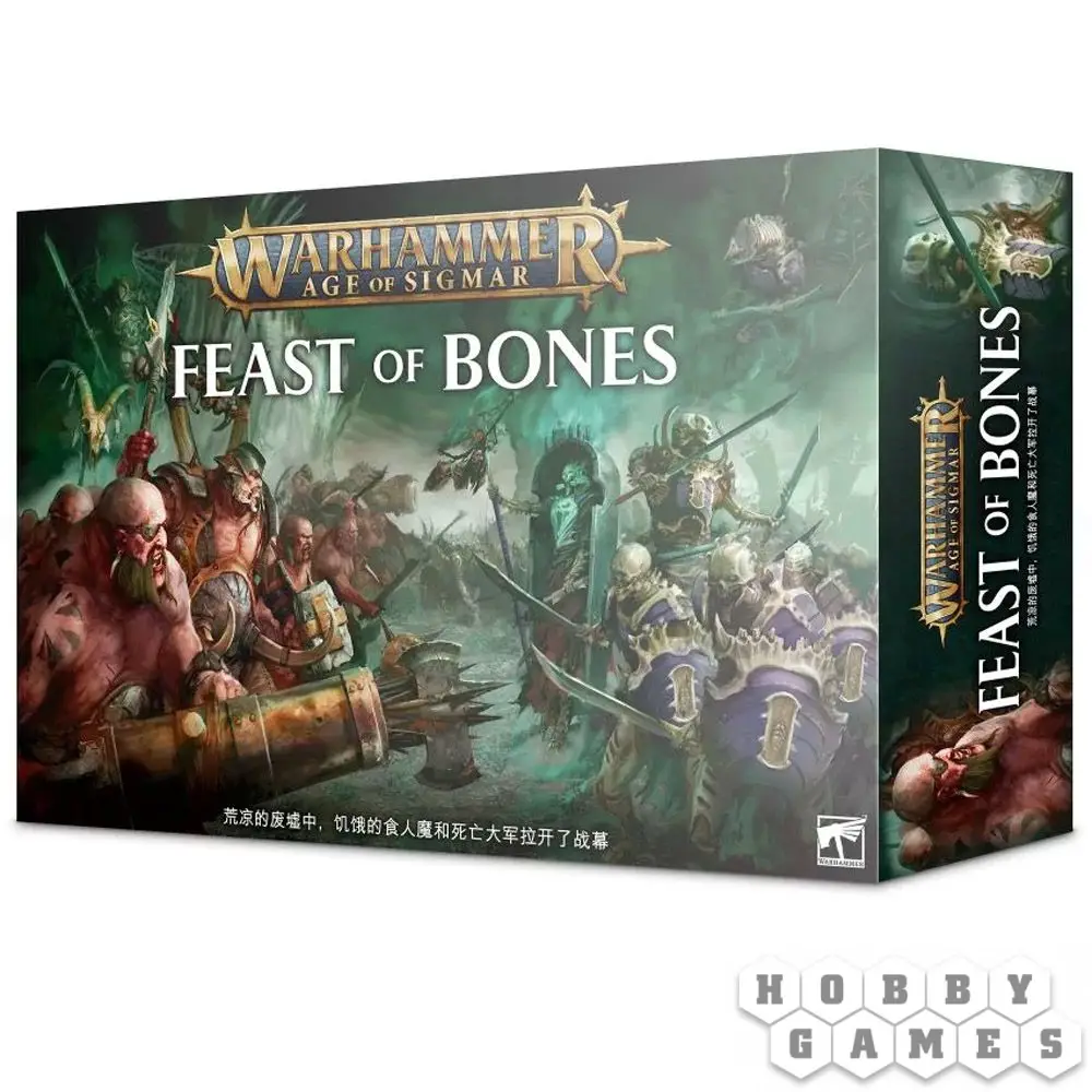 Разыграйте одни из самых жестоких сражений, когда-либо виданных на полях Владений Смертных! В боевом наборе "Костяной Пир" яростные Утробные Племена Огров (Ogor Mawtribes) сражаются с безжалостными Жнецами Костей Оссиарха (Ossiarch Bonereapers). Внутри набора вы найдёте практически всё, что вам понадобится для сборки и сражений между двумя армиями, включая миниатюры, правила, историю и дополнительные аксессуары, которые облегчат ваши первые игры в Age of Sigmar.
