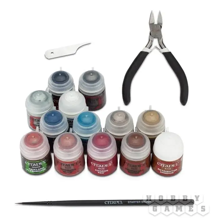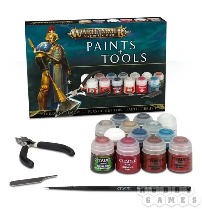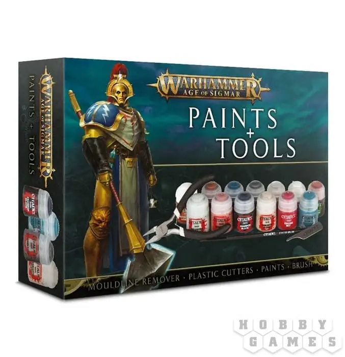 Age of Sigmar: Paints + Tools - это набор для новичков в хобби, в который вошли базовые краски и инструменты, которые составляют базовый арсенал любого хоббиста. Начать свой путь в варгеймах всегда непросто, ведь это большие траты денег и времени, чтобы найти нужные цвета и подобрать подходящие инструменты. С набором Age of Sigmar: Paints + Tools об этом можно будет забыть! Набор Age of Sigmar: Paints + Tools позволит вам по цене восьми баночек краски получить сразу 13 полноразмерных красок и набор инструментов в подарок. В набор Age of Sigmar: Paints + Tools входят модельные кусачки для пластика, инструмент для удаления облоя, кисточка Starter Brush.