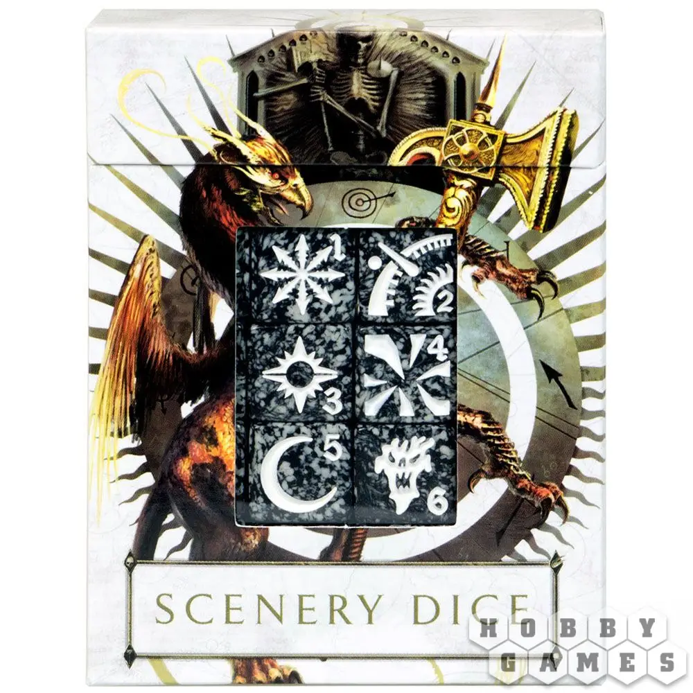Набор содержит 20 кубов с цифрами и соответствующими символами из книги правил – просто киньте кости и их расклад определит, какое правило будет использовать террейн, а затем используйте кости в качестве маркера этих правил.