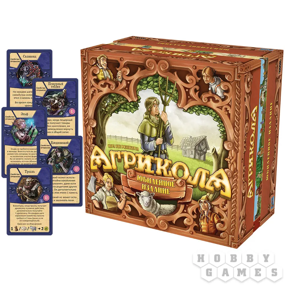 "Агрикола: Юбилейное издание" – это знакомая и любимая классика, только в более новом и улучшенном исполнении! Вам по-прежнему предстоит развивать своё хозяйство: расширять жилище, разводить животных, выращивать овощи и растить семью, чтобы к финалу стать самой зажиточной династией.