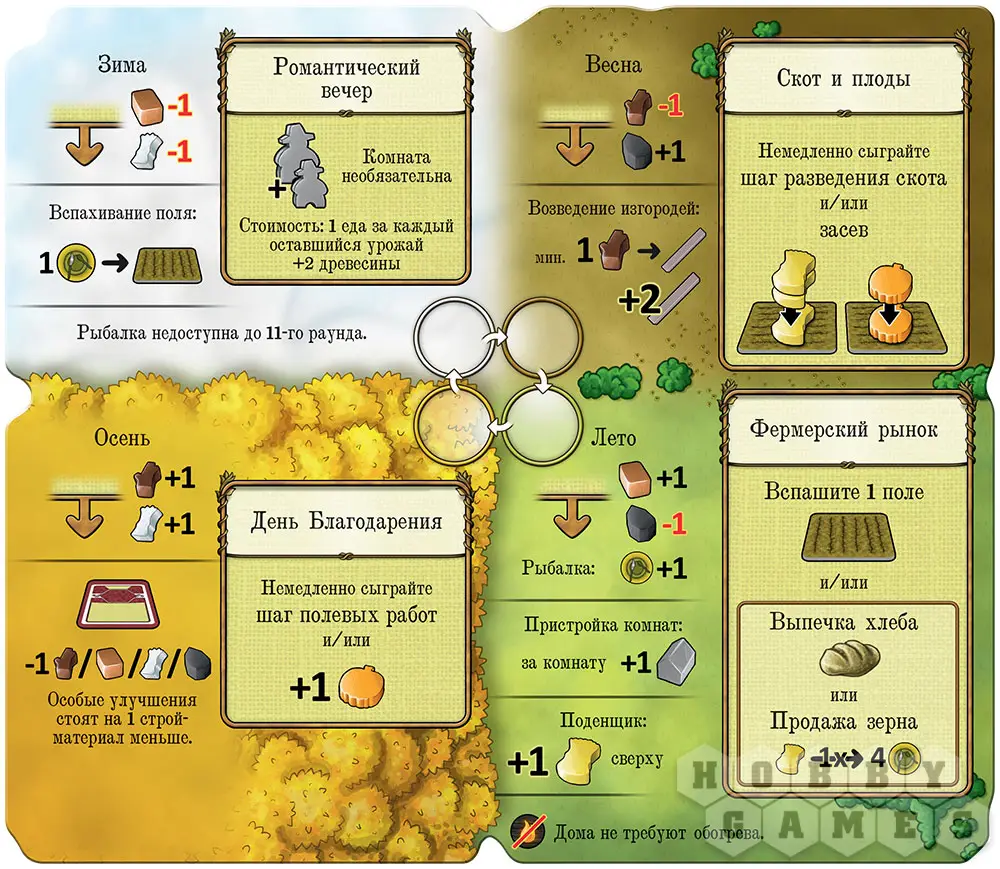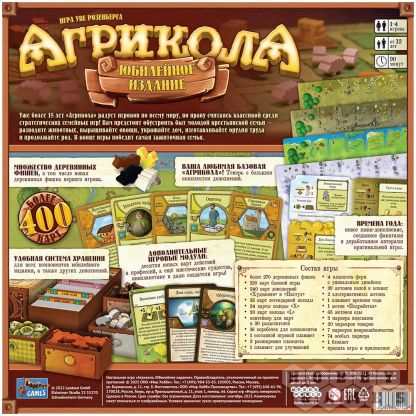 В состав этого издания входит большой комплект дополнений, включая мини-дополнение "Времена года", изначально появившееся благодаря фанатам и затем доработанное авторами оригинальной коробки. Вы найдёте множество деревянных фишек, десятки новых карт профессий и действий, а также дополнительные игровые модули с мистическими существами и даже создателями игры! Всё это организовано в продуманную систему хранения, которая вместит как компоненты этого набора, так и будущие дополнения. Это – самое полное и богатое издание "Агриколы", которое подарит вам сотни часов новых открытий и стратегических решений.