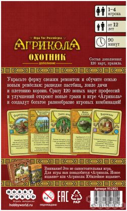 "Агрикола: Охотник" – это дополнение к легендарной базовой игре, которое вводит в игровой процесс 120 новых карт профессий и улучшений. Теперь у ваших крестьян появляются навыки, о которых раньше можно было только мечтать: разведка пастбищ, ловля дичи и плетение корзин открывают свежие стратегические пути к процветанию.