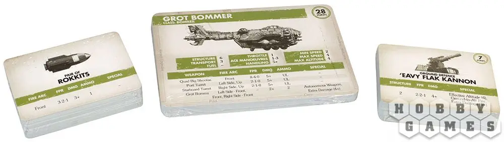 Девятнадцать карт самолётов Орков, которые служат для удобного отображения в игре следующих самолётов: "Даккалёт" (Dakka Jets), "Боебомбер" (Fighta Bommers), "Тяжебомбер" (Eavy Bommers) и "Гротобомбер" (Grot Bommers). Также включены специальные карты для особых самолётов "Стервятника" (Vulture) и "Большого Поджигалы" (Big Burna)
