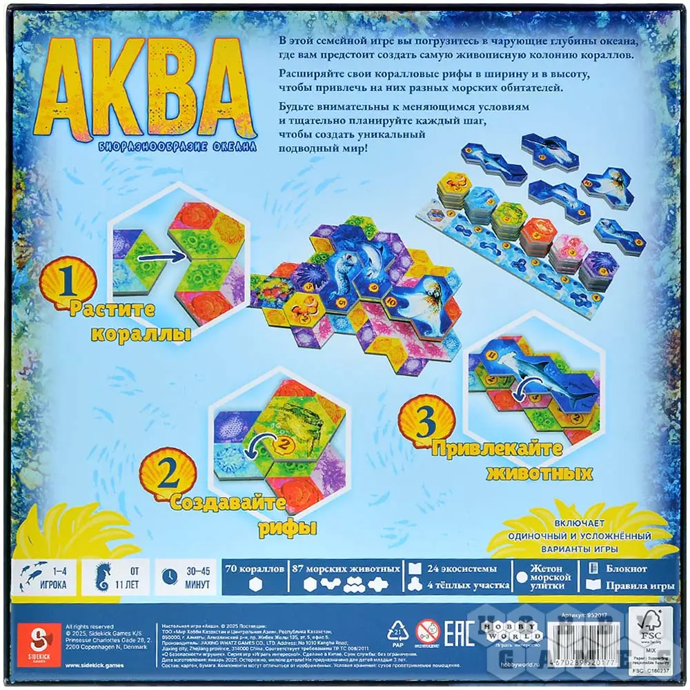 Это тактическая настолка о создании самой богатой и разнообразной коралловой колонии. Вы будете собирать из разноцветных жетонов коралловые рифы, привлекать очаровательных маленьких морских обитателей и создавать условия для появления величественных гигантов океана! Простые, но глубокие правила, потрясающие иллюстрации и успокаивающая морская тематика делают "Акву" идеальным выбором для семейного вечера и встреч с друзьями. Модульные поля, различные сценарии экосистем и несколько уровней сложности обеспечивают высокую реиграбельность, а тактическая глубина позволит каждому игроку разработать свою уникальную стратегию процветания подводного мира.