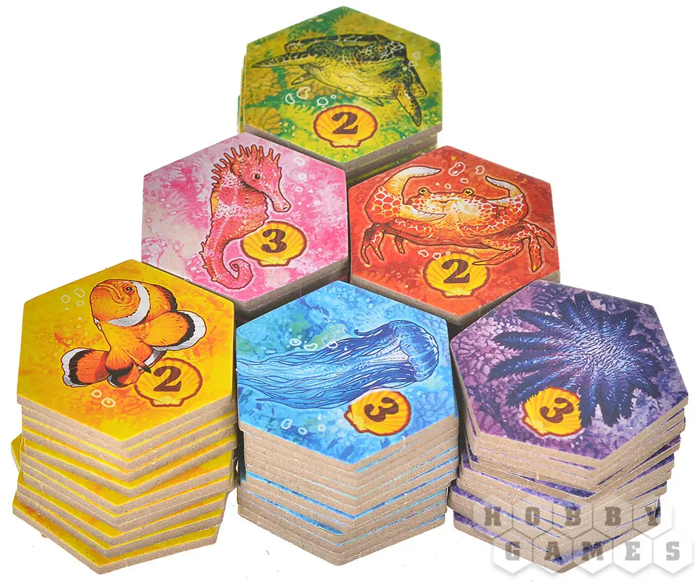 Создать места обитания и рифы – если три коралла одного цвета образуют идеальный шестиугольник, вы создали место обитания. Немедленно разместите на нём маленькое морское животное соответствующего цвета. Если же вы соединили четыре и более кораллов одного цвета в протяжённую группу, но не образовали шестиугольник – вы создали риф