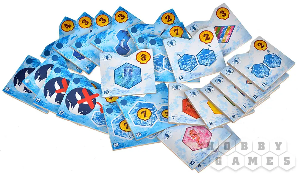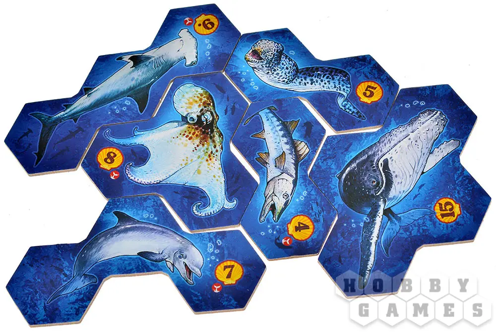 Обеспечить биоразнообразие – после размещения маленьких животных вы можете привлечь большое морское животное. Для этого разместите его жетон поверх нескольких маленьких животных, соблюдая ключевое правило: все накрытые маленькие животные должны быть разными видами. Большое животное должно полностью покрывать выбранных маленьких обитателей