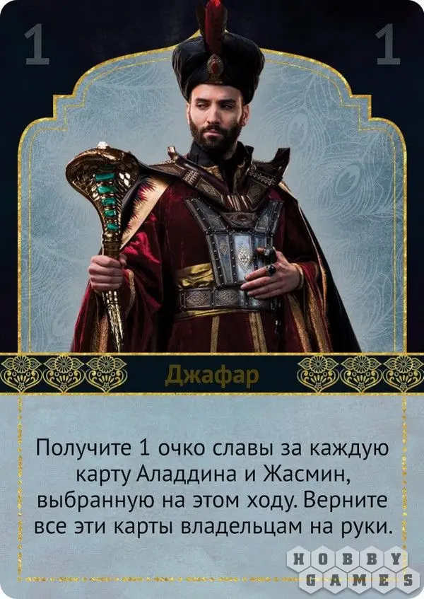 Джафар – номер один, позволяет разыгравшему получить по одному очку за каждую чужую карту Аладдина и Жасмин в этом раунде, при этом карты вернутся на руки игроков и не будут разыграны. Вот как сильно Джафар любит строить козни нашим влюблённым!