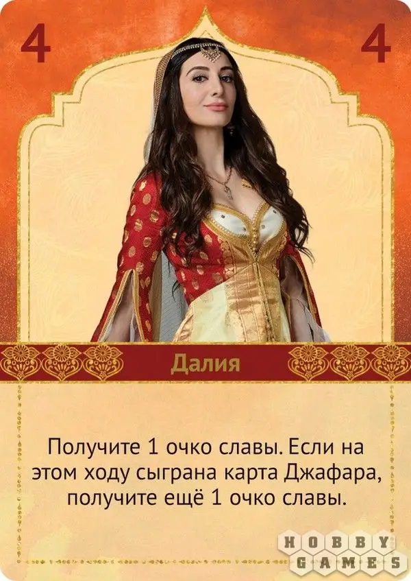 Далия – номер четыре, подруга Жасмин стабильно приносит одно очко славы и два очка, если был разыгран Джафар