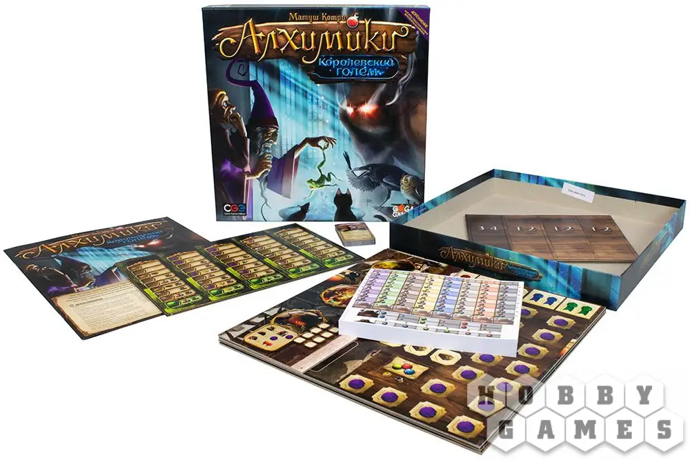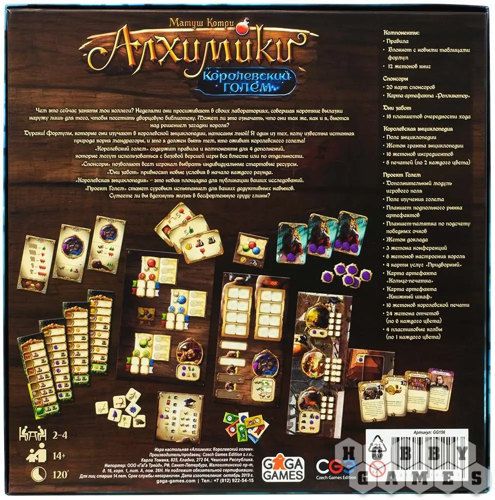 В комплект "Королевского голема" включено сразу четыре дополнения для настольной игры "Алхимики", которые можно использовать с базовой игрой все вместе или по отдельности.