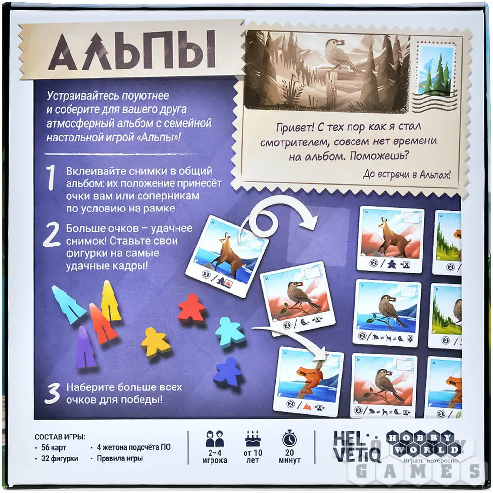 "Альпы" – это уютная семейная игра, в которой вы один или с компанией отправляетесь на фотоохоту в Швейцарский национальный парк. Ваша цель – собрать самый атмосферный альбом снимков дикой природы. Каждый ход вы будете разыгрывать карты, чтобы сделать удачный кадр и разместить его на страницах общего альбома.