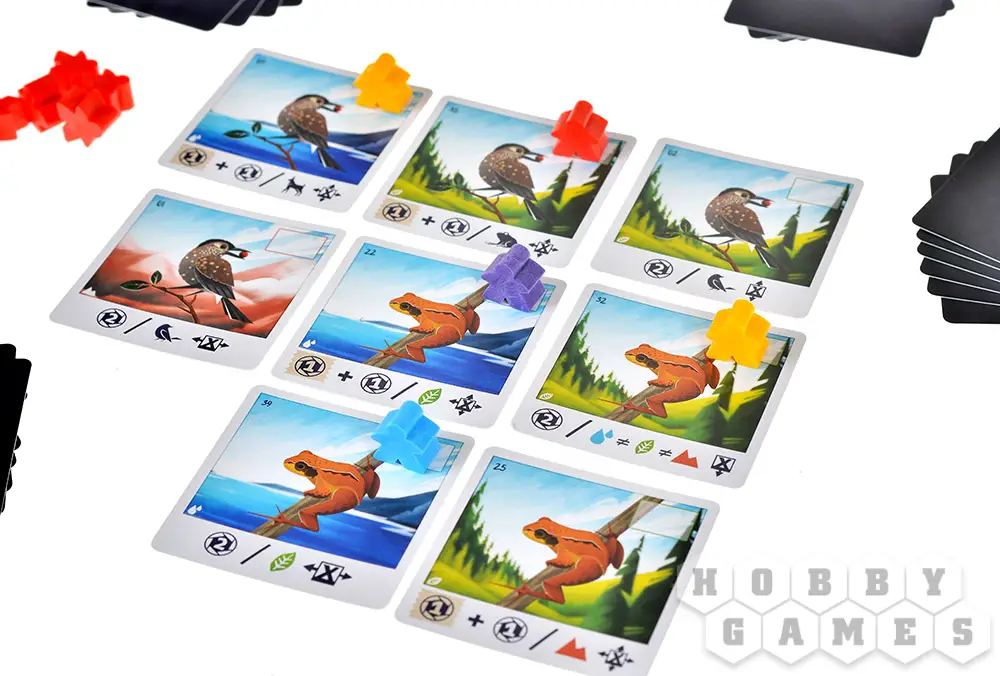 Вы будете получать очки в зависимости от того, какие животные и ландшафты изображены на картах. Так, снимки с кедровок приносят ПО за животных, серны – за фигурки игроков, а травяные лягушки – за ландшафты. На некоторых картах есть дополнительные условия: выполнив их, сможете получить ещё больше очков. Именно поэтому важно грамотно выбирать место для фигурки.