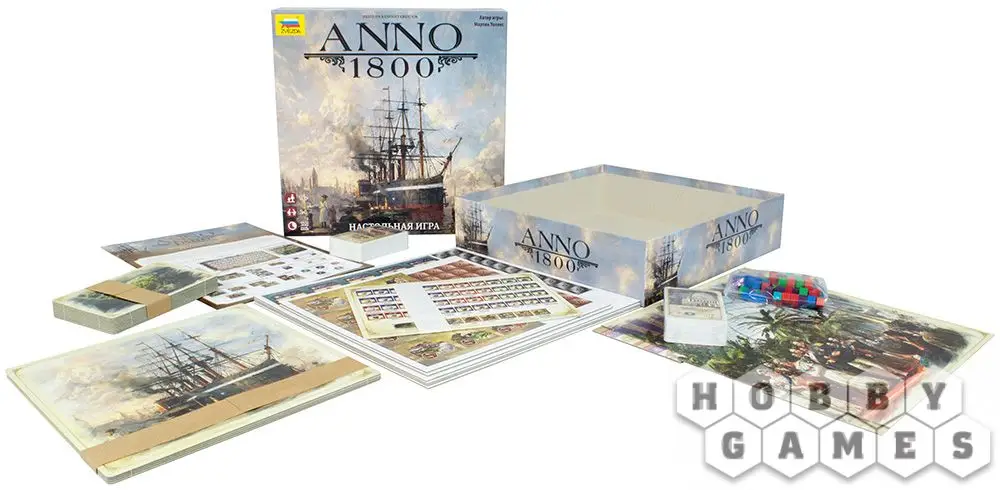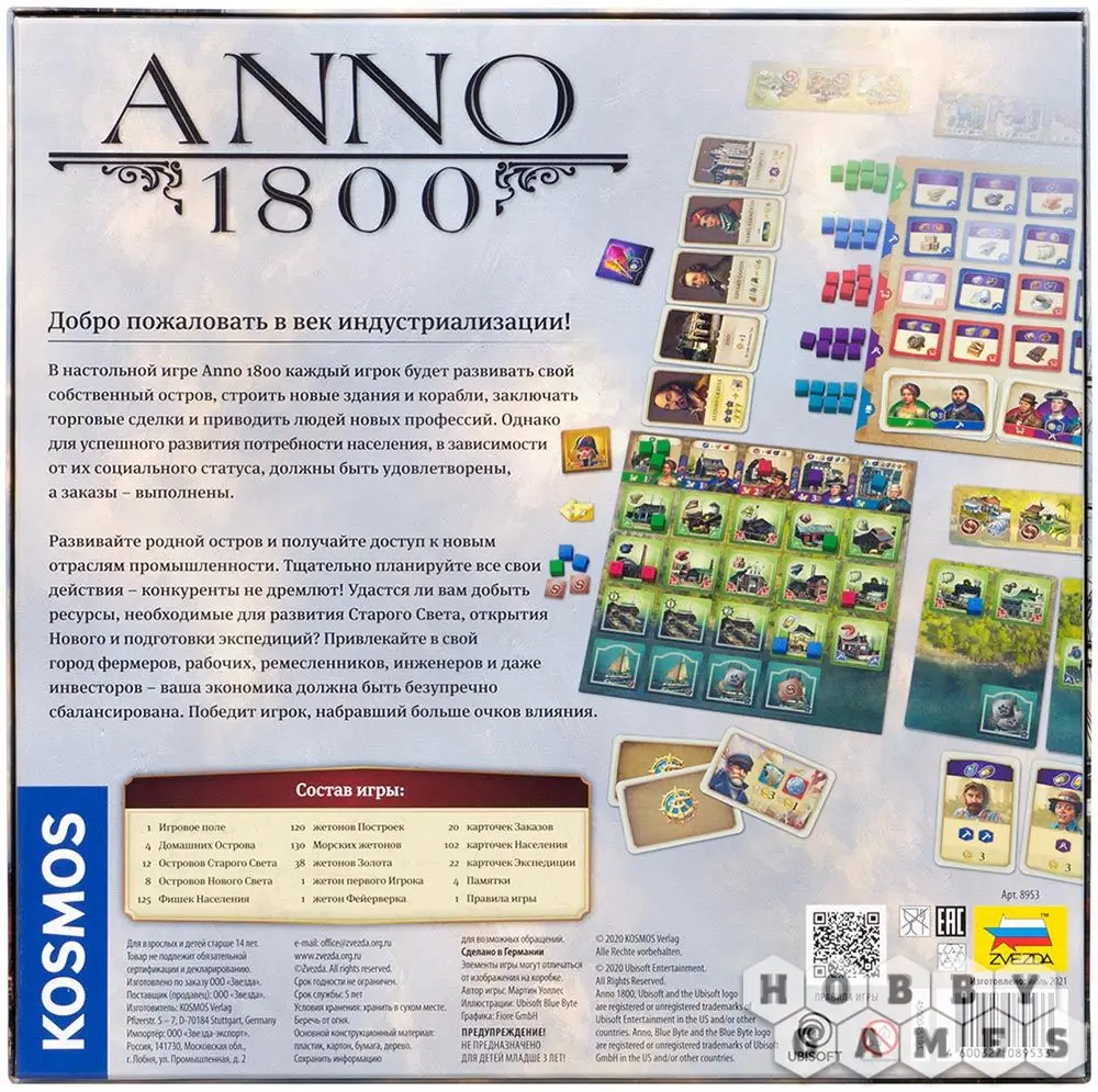 В настольной игре "ANNO 1800", основанной на одноимённой популярной компьютерной игре от компании Ubisoft, вы возьмёте под своё командование целый флот, чтобы изучить острова Старого и Нового Света и наладить торговые пути. Но не торговлей единой сыты: важно не только изучать и открывать новые острова, но и не забывать развивать свой собственный! Разумно распределяйте ресурсы между сферами деятельности на острове, следите, чтобы каждый рабочий был занят своим делом, и не спускайте глаз с конкурентов! Только грамотная стратегия приведёт вас к новым достижениям и победам!