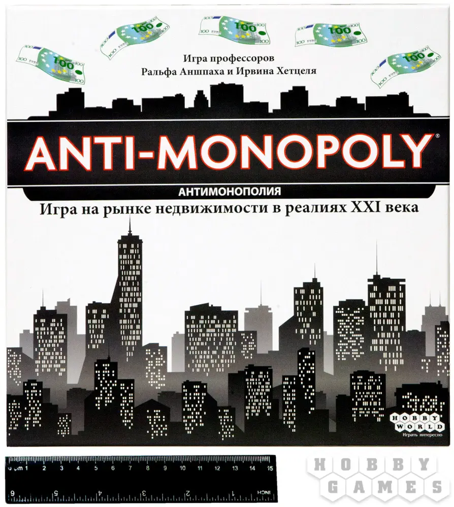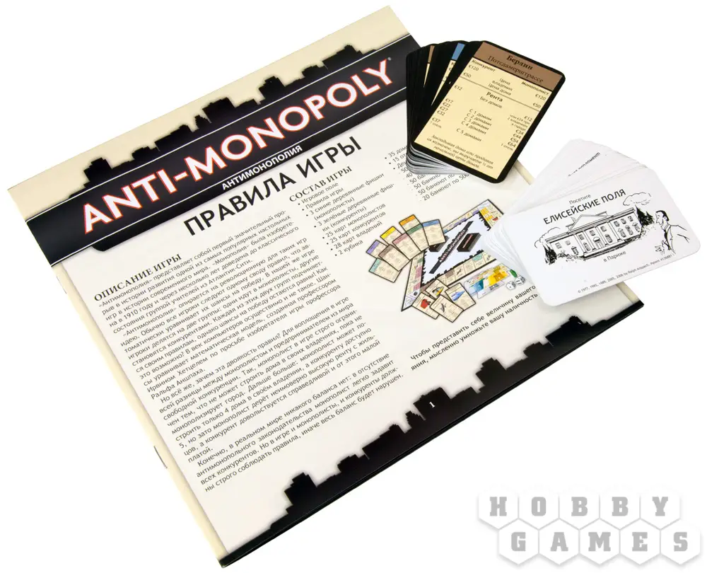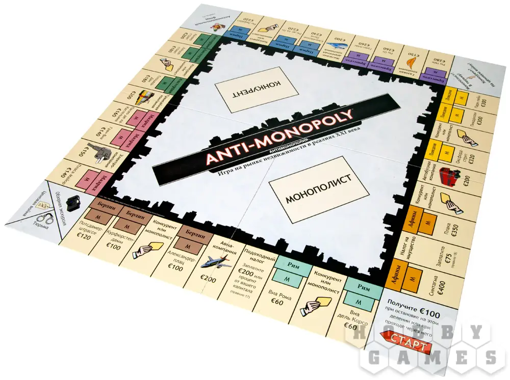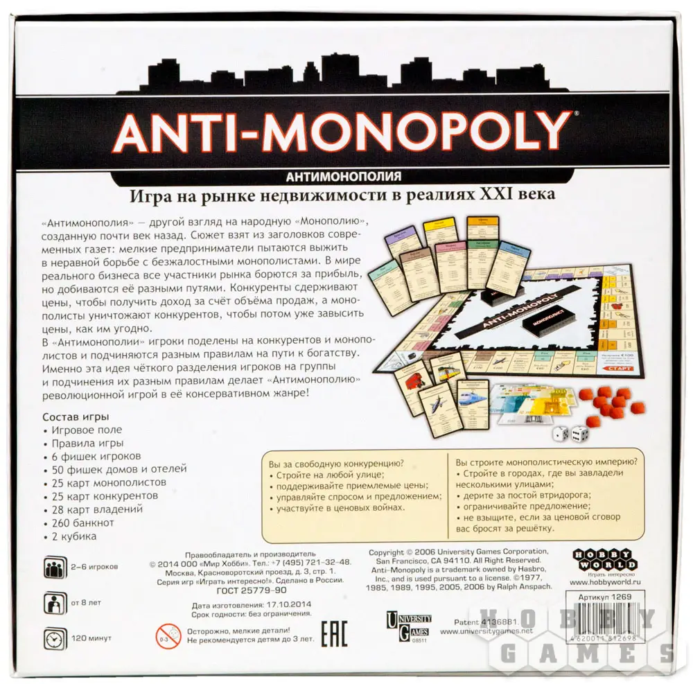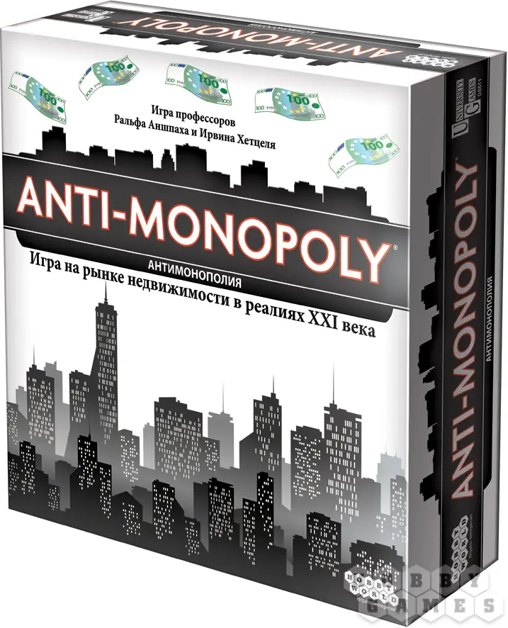 «Антимонополия» - новый взгляд на привычную «Монополию». Сама идея взята из заголовков современных новостей: небольшие предприятия пытаются выжить в тяжелых условиях современного рынка, в борьбе с тяжеловесными монополистами. Как и в реальном мире, все стараются получить максимальную прибыль, но добиваются этого различными путями. Конкуренты стараются получить прибыль за счет объема продаж, поддерживая низки цены. Монополисты давят конкурентов, чтобы потом цены завысить.