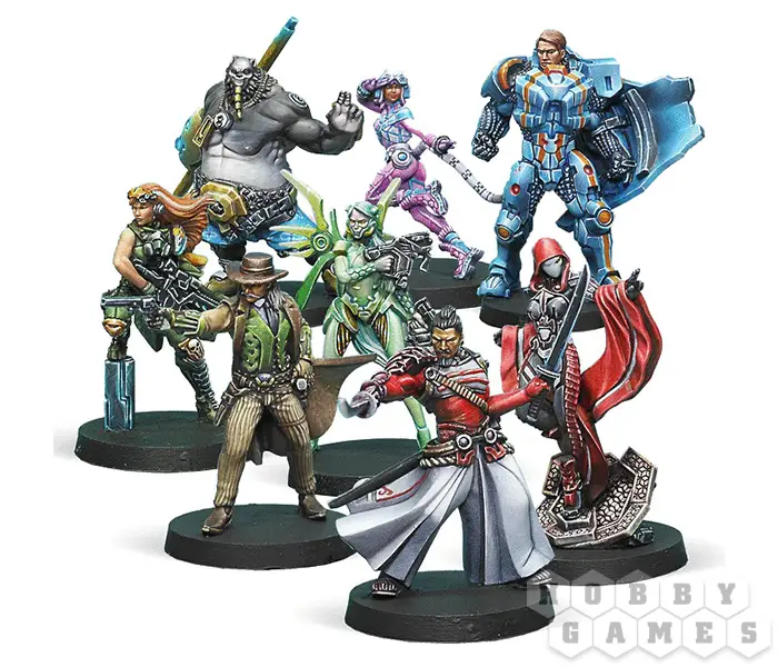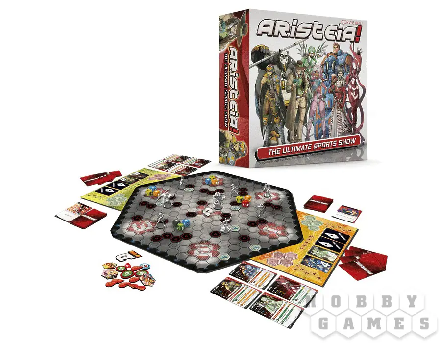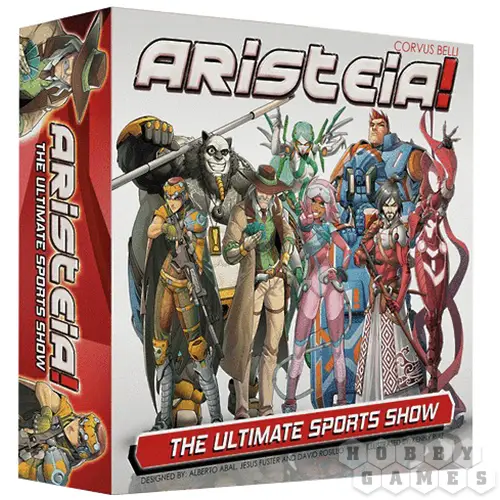 Aristeia! – это дуэльная настолка в жанре МОБА. Два игрока берут на себя роль капитанов команд, участвующих в самом необычном шоу Human Sphere. В комплекте вы найдёте всё необходимое для игры: восемь миниатюр персонажей, их специальные карты, карты Initiative и карты Tactics, три буклета, которые поясняют нюансы вселенной, а также кубики, счётчики и фишки.