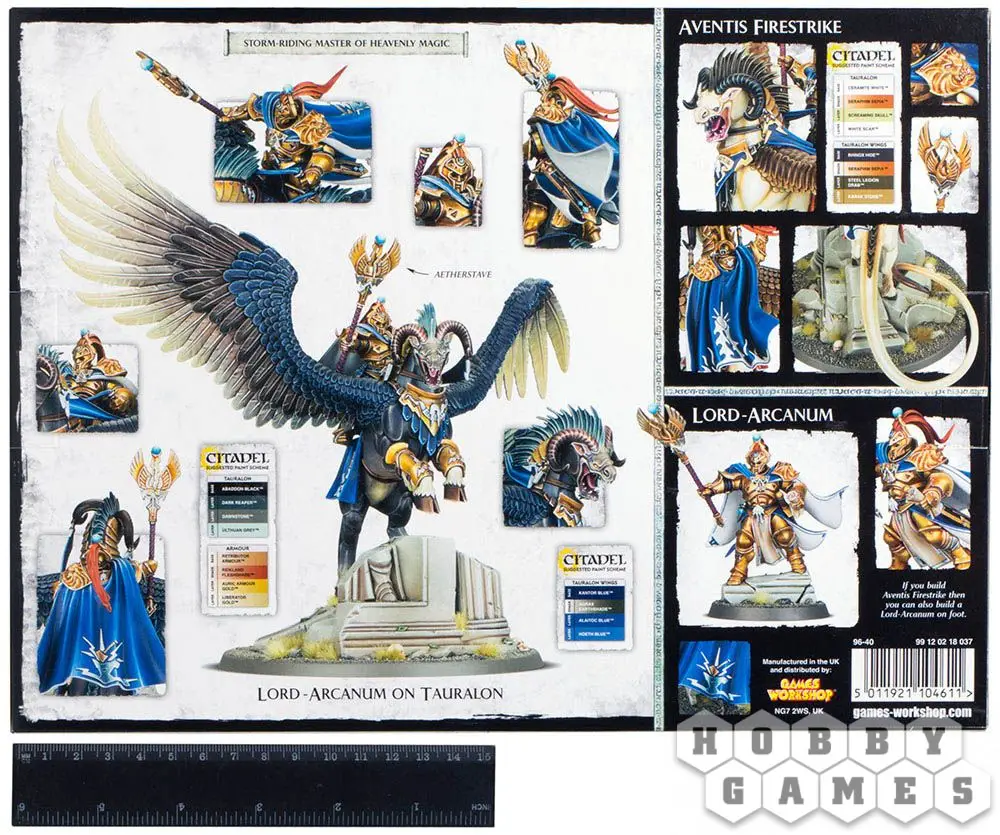 Авентис Огненный Удар вооружен Посохом Молотохолла и восседает верхом на величественном звере, обладающим впечатляющим размахом крыльев, и плотным черепом, увитым толстыми рогами. Зверю не требуется большое количество броневых пластин, лишь несколько элементов доспеха, украшенных сигмаритским орнаментом, покрывают его ноги и грудную клетку. Авентис носит Корону Громовержца (Thunderhead Crown), богато украшенный шлем с молниевидными шипами, а его броня несет на себе флаконы душ, покрытые сигмаритовыми узорами, как и его меч в ножнах. Лойтар изображен стоящим на обломках руин, которые образовывают часть базы. В наборе есть опция сборки Авентиса стоящим на своих ногах, вооруженным эфирным посохом или кастующим молниевую сферу. Из набора можно собрать любого Лорда Тайн верхом на Тауралоне на ваш выбор вместо Авентиса, который имеет уникальную голову и специальные опции ног и рук для Тауралона.