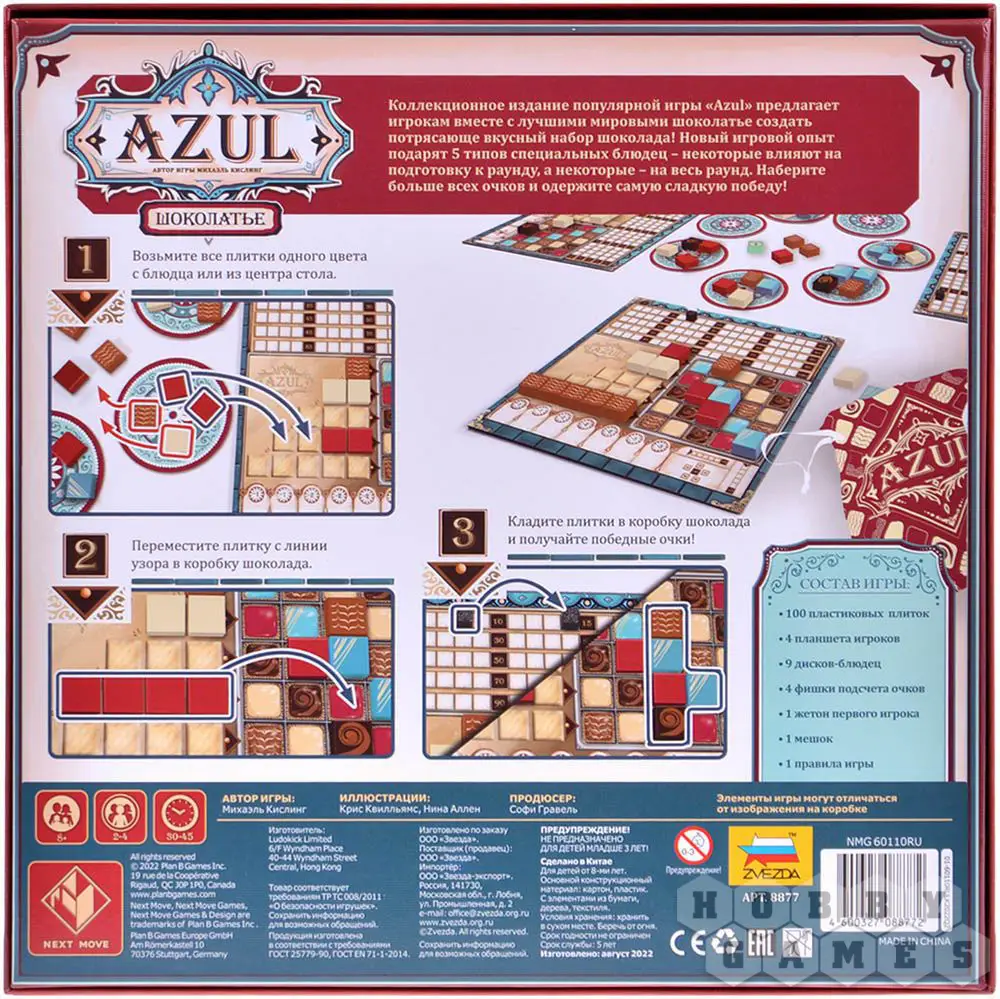 "Азул: Шоколатье" – это уже пятая игра в серии, если считать её среди самостоятельных "коробок". На самом же деле это специальное издание с теми же самыми правилами и игровым процессом, которые полюбились игрокам самого первого "Азула". Но помимо изменённого дизайна в игре появились специальные диски-блюдца, обладающие своими особыми эффектами, которые способны повлиять как на подготовку к игре, так и на всю партию в целом.
