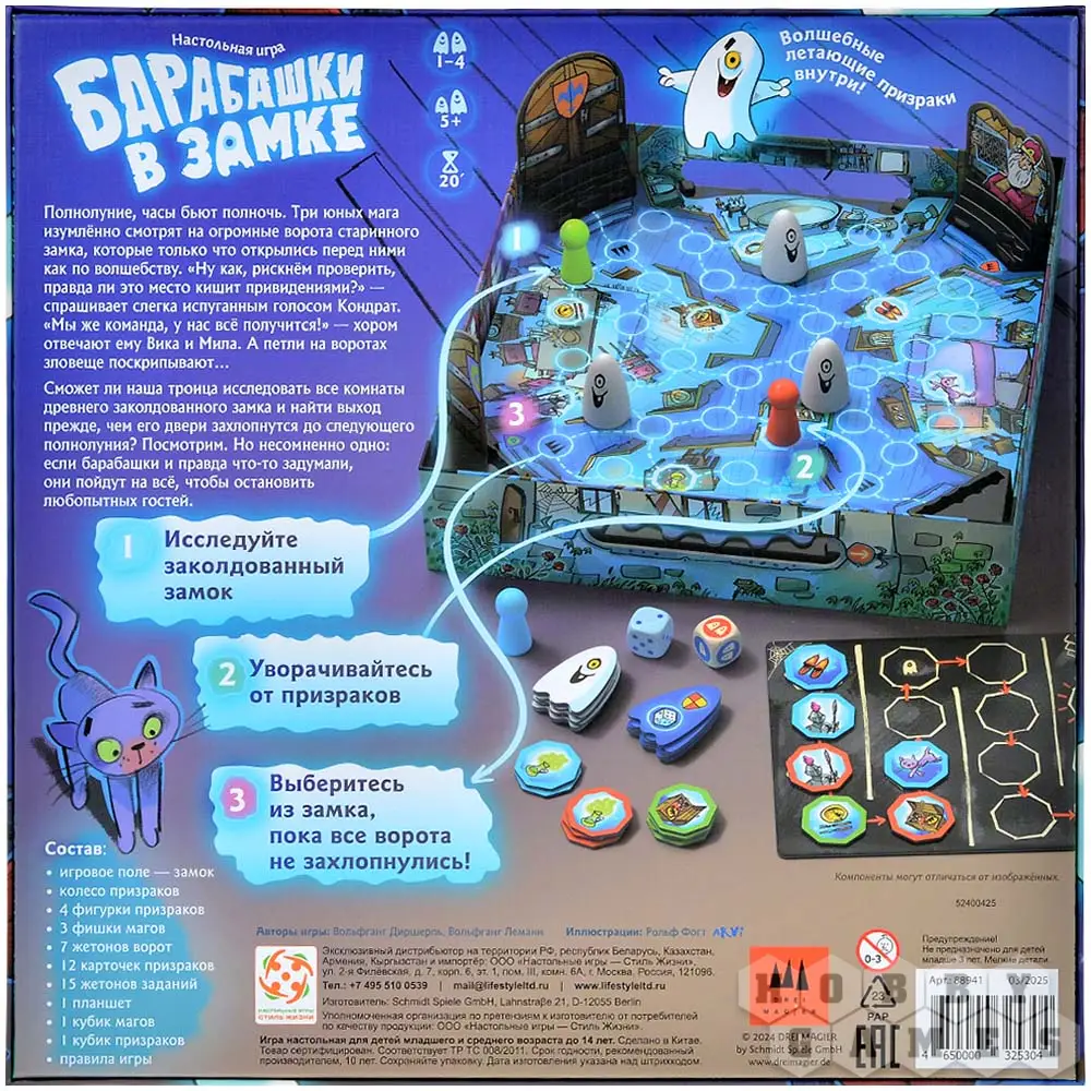 "Барабашки в замке" – это захватывающая кооперативная игра, где вам предстоит помочь трём чародеям выбраться из заколдованного замка, полного коварных призраков. Каждый маг должен выполнить пять заданий, собирая жетоны с волшебными предметами, и успеть покинуть замок до того, как все ворота захлопнутся. Уникальная механика игры включает в себя передвижение юных искателей приключений, вращение колеса призраков и случайные события, которые могут как помочь, так и усложнить вашу задачу. Яркое игровое поле, детализированные фигурки и атмосферные иллюстрации погружают в мир таинственного приключения. А если стандартный режим покажется вам слишком простым, к вашим услугам экспертная сложность с четвёрт барабашкой!
