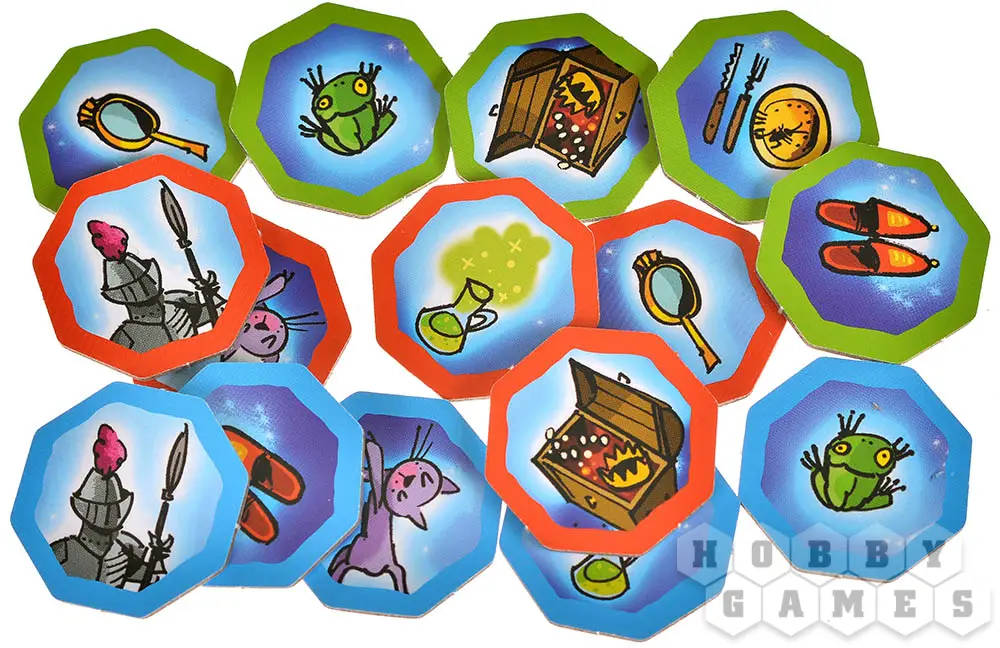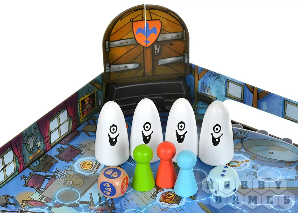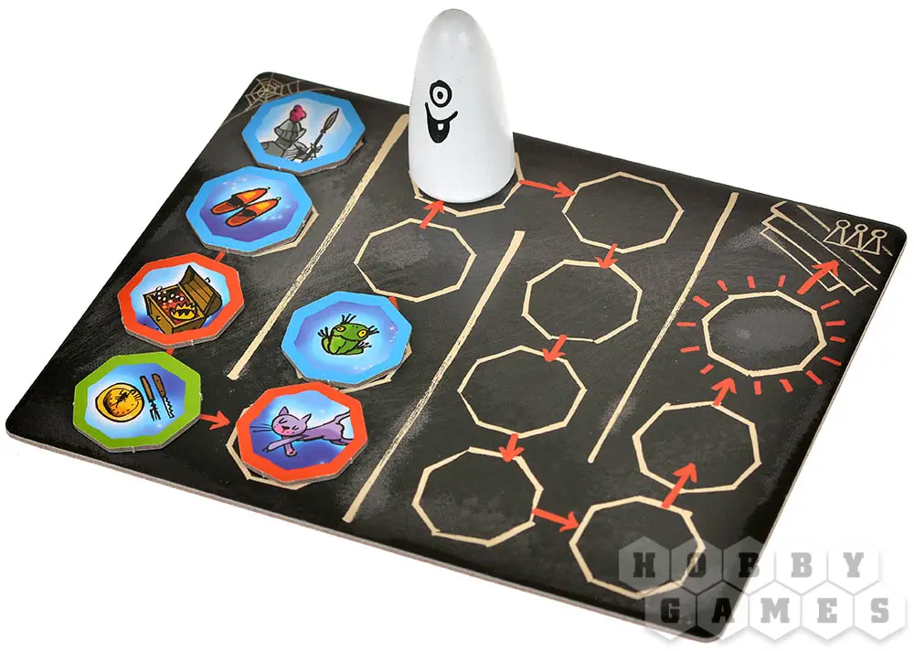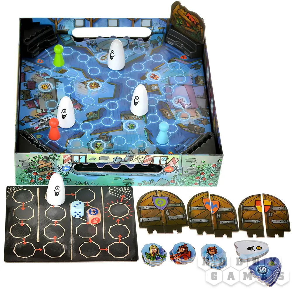 В свой ход бросайте два кубика: голубой определяет, на сколько клеток можно передвинуть мага, а кубик призраков заставляет колесо вращаться, перемещая духов по замку. Осторожно планируйте маршруты – маги не могут проходить сквозь призраков, а случайное столкновение грозит закрытием ворот! Выполняйте задания, открывая новые жетоны, и помогайте друг другу, ведь победа зависит от слаженных действий всей команды. Будьте готовы к неожиданностям: карточки призраков могут как спасти ваших героев, так и ускорить их пленение.