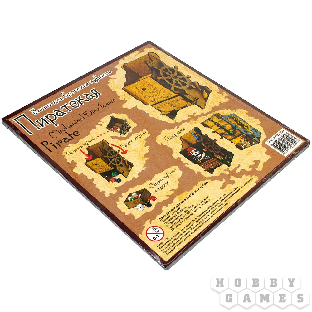 Перед вами механическая башня "Пиратская", которая сделает результат броска кубиков абсолютно случайным. Положите кубики сверху и крутите штурвал, отважные флибустьеры – ваши кубики с грохотом прокатятся по волнам удачи! Сундук для сокровищ, находящийся внизу башни, можно использовать для хранения ваших кубиков или жетонов, а в рабочем режиме он может применяться как ограничитель для вылетающих костей.