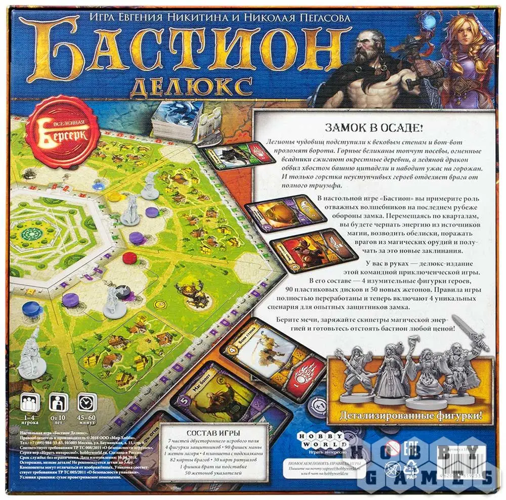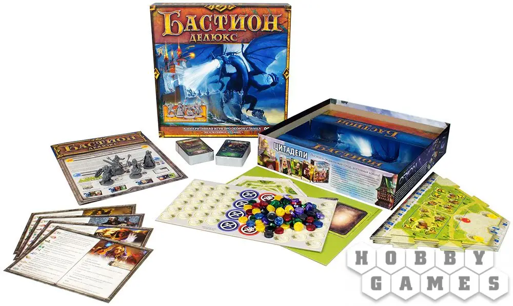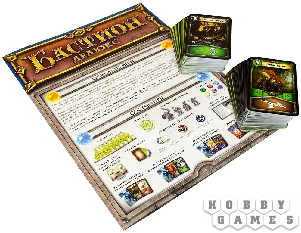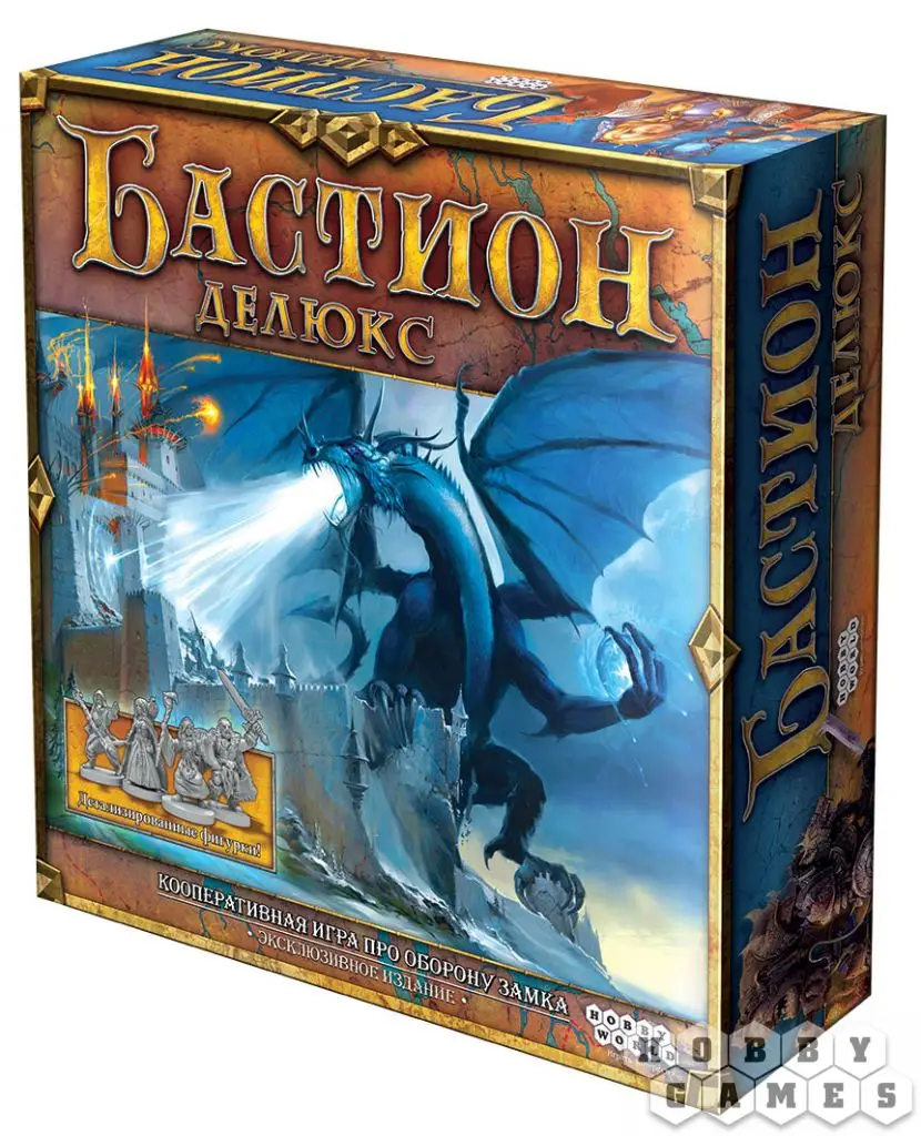 Делюкс версия создана для тех, кто любит защищать свою вотчину с комфортом, наслаждаясь красотами окружающего мира. Комплектация коробки аналогична мировому релизу "Бастиона"! В составе делюкс-набора Вы найдете удобные и красивые миниатюры, пластиковые фишки, а также новый тайл - лагерь врагов, что так и норовят добраться до врат Вашего замка и сокрушить их!