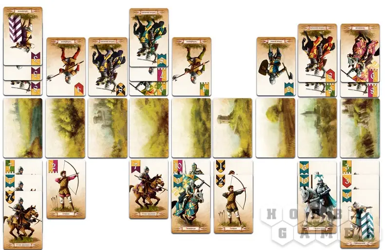 «Баталия» — это дуэльная карточная игра, в которой вам предстоит возглавить средневековые войска с целью захватить стратегически важные территории. Правила игры достаточно просты, а партии скоротечны. Перед началом игры в центре стола выкладывается 9 карт полей боя. Именно за них ведут сражение противники. Тот, кто захватит 3 соседних поля боя или 5 произвольных, побеждает. Каждый ход игроки выкладывают под любым полем боя карту отряда или тактик. Карты тактик изменяют правила боя для конкретного поля. Чтобы игрок захватил поле боя, нужно, чтобы сила его построения под этим полем была выше силы построения противника. Сила построения определяется по комбинации номиналов и цветов выложенных карт отрядов. Также предлагаются правила для игры втроем.