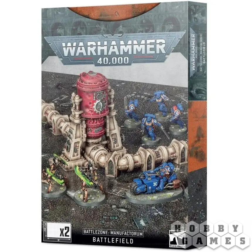 Набор картонных полей Боевая зона: Поле битвы Мануфакторум (Battlezone: Manufactorum Battlefield) – то, что вам нужно для проведения игр Warhammer 40,000. Внутри вы найдёте два картонных поля размером 30 на 22,4 дюйма (76 на 56,8 см.), которые великолепно подходят для малых и средних игр. Добавив второй комплект, вы сможете играть большие турнирные партии.