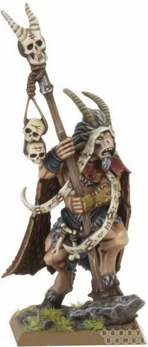 Это очень яркая и харизматичная модель. Стоя одним копытом на камне, шаман опирается на грубо срубленный деревянный посох, увенчанный черепами с рунами. Мускулистый шаман облачён в меховой плащ, кожаные ремни и набедренную повязку, украшенные костями. Головное украшение представляет из себя испещрённые рунами пергаменты. Два огромных ребристых рога поднимаются над густыми серыми волосами, а дополняет вид козлиная бородка.