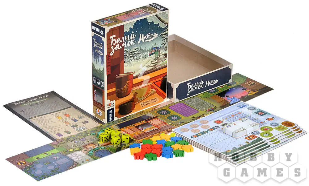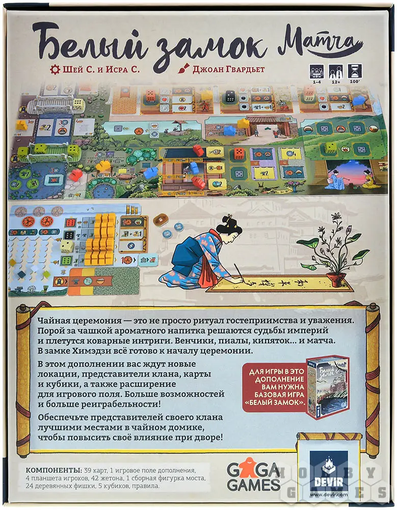 "Белый замок: Матча" – это дополнение к "Белому замку", которое привнесёт в игровую механику церемонию, посвящённую чаю, и откроет новые стратегические возможности. Чтобы заслужить уважение даймё Химэдзи, одной армии недостаточно – понадобится освоить искусство заваривания матчи. Теперь с помощью особых зелёных кубиков и венчика вы сможете занять – как минимум попытаться – лучшие места в чайном домике и укрепить своё влияни в регионе! А если настроение будет лиричное, всегда можно просто посидеть у красивого пруда, помедитировать и накопить ресурсов для будущих свершений.