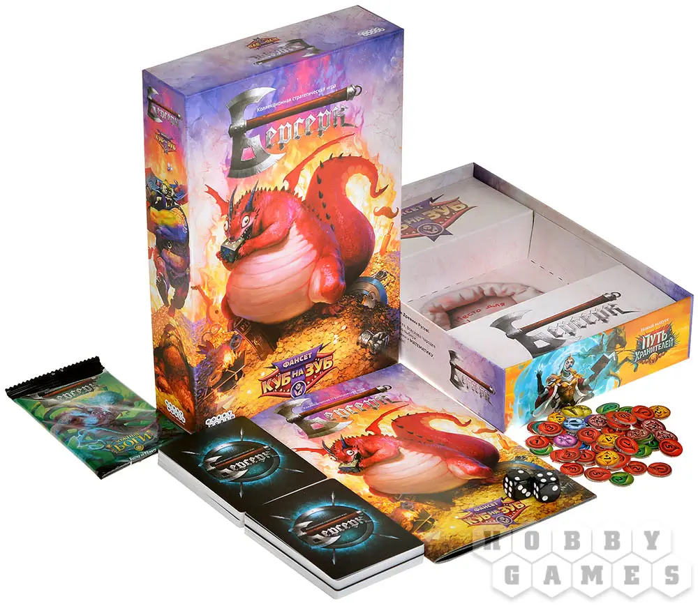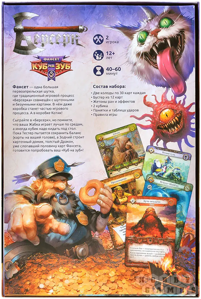 Играйте в "Берсерк", но будьте готовы к сюрпризам: помните, что ваша Жабка чувствует себя гораздо увереннее в среду, а кубик порой придётся бросать под столом! Пока Тестер отчаянно пытается сохранить баланс, удерживая карты на своей голове, а Зодчий увлеченно строит карточный домик, толстый Дракон-кубохват, уже успевший съесть половину карт Фансета, готовится испытать ваш "Куб на Зуб"! Непредсказуемо будет вообще всё!
