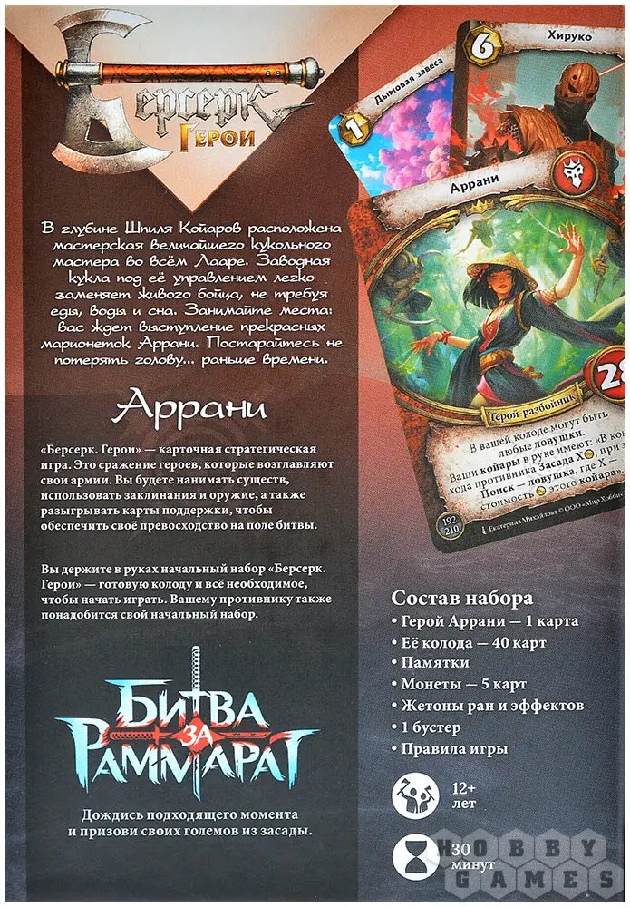 В новом выпуске "Берсерк. Герои" вас ждёт мир, где переплелись мощи классического фэнтези и утончённость азиатской культуры. Выберите своего героя среди трёх мощных стартовых наборов: приручите големов-марионеток и их загадочного кукловода, испытайте неудержимую силу тролля-сумоиста или встаньте на путь искателя знаний из ордена Тоа-Дан. Углубите знакомство с полюбившимися механиками: "Душелов", "Набег" и "Расход" раскроются по-новому – хватит ли вам смекалки, чтобы потратить за ход все 20 монет? А если повезёт, вы и вовсе получите огромное преимущество – некоторые карты будут работать прямиком из вашей руки, даже не требуя розыгрыша!