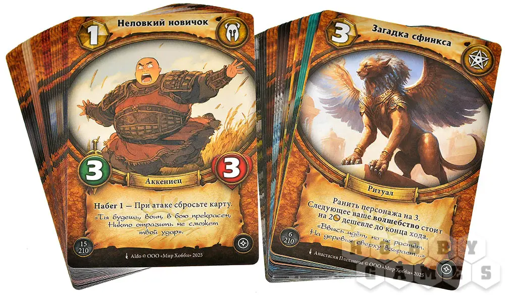 Весь игровой процесс, как вы уже поняли, строится на картах. В своей колоде вы должны иметь одну карту героя, которая является вашим альтер эго в игре, обладает определённым запасом жизни, способностью и стихией. Всего стихий пять: степи, горы, лес, болота, тьма. Карты без стихии – нейтральные. Помимо карты героя, в колоде вы можете иметь от 40 карт той стихии, к которой принадлежит ваш герой, но не более трёх копий одной и той же карты.