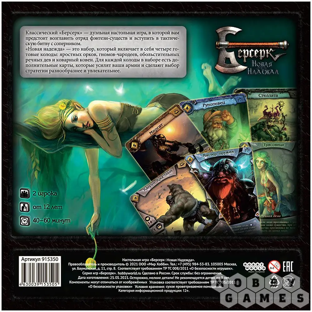 "Берсерк: Новая Надежда" – это начальный набор, который содержит в себе всё необходимое, чтобы начать играть. Игроки выбирают, за кого им сражаться – свирепых кочевников-орков, гномьих колдунов, загадочных и притягательных речных дев или ковен, мрачных служителей тёмных сил. У каждого отряда – своя колода из 30 карт, которую также можно усилить дополнительными. Настраивайте колоду, продумывайте стратегию – и в бой! Мир Лаара ждёт вас!