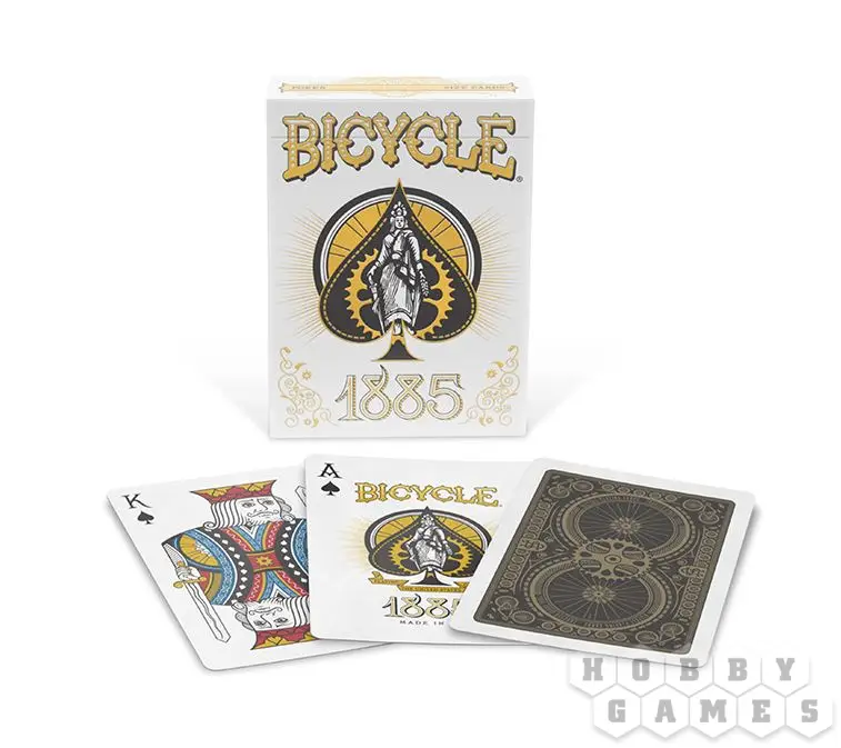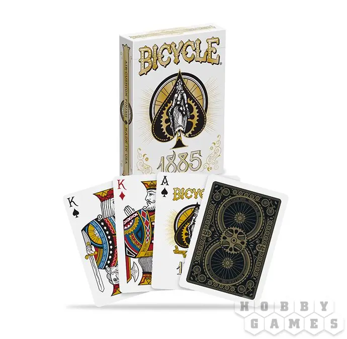 Колода игральных карт Bicycle® 1885 рассказывает о наследии и истории бренда Bicycle®, который гордо производится в США более 130 лет. Эта колода, иллюстрированная художниками Цинциннати, Джеймса Биллитера, сочетает в себе викторианскую изысканную элегантность и механические конструкции эпохи, которые вошли в одну сказочную колоду игральных карт.
