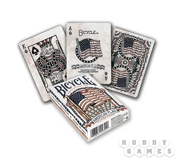 Игральные карты Bicycle® American Flag отмечают американское наследие и историю. Эти иллюстрированные от руки карты содержат изображения звезд и полос, а также ссылки на исторический дизайн на обороте.