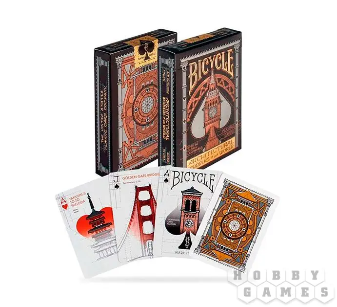 Bicycle® Architectural Wonders of the World - это праздник великих архитектурных произведений с древнейших времен и до наших дней. 54 карты с персонализированным дизайном от художника Джеймса Биллитера (James Billiter). На каждой карте изображен знаменитый объект архитектуры со всего мира.