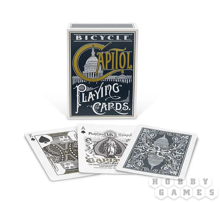Карты «Capitol» выпускались с 1886 по 1928 год. Данная колода сохранила многие черты оригинала, начиная от весьма характерного туза пик и заканчивая своеобразным шрифтом индекса, который заметно тоньше и меньше стандартного. При этом, конечно, это современный продукт, напечатанный на картоне премиум-класса и наделенный уже обязательным для Bicycle покрытием Air-Cushion Finish.