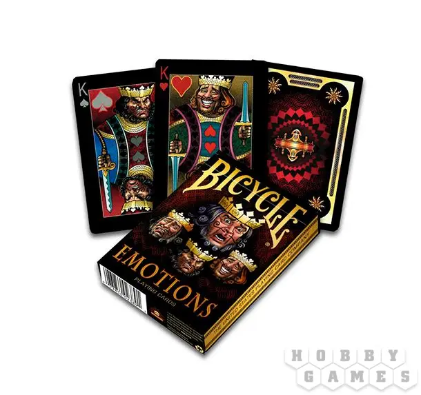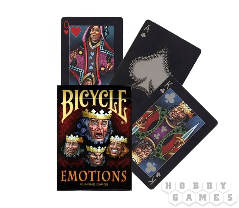 Данная колода - находка для всех, кто уже подустал от стандартных картинок, чьи лица кочуют из колоды в колоду с минимальными изменениями. В Bicycle Emotions лица фигур отображают самые разные чувства - гнев, радость, горе и страх.