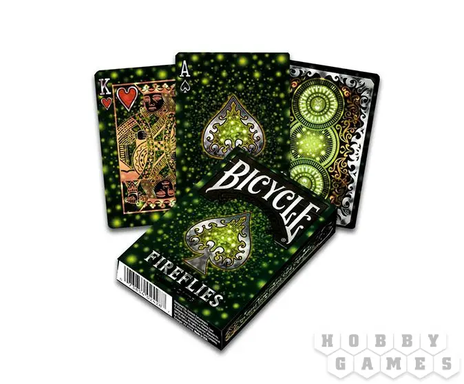 Предайтесь приятным воспоминаниям о беззаботных временах, когда вы ловили мотыльков теплыми вечерами с друзьями. А поможет вам в этом специально разработанная колода Bicycle Fireflies. Лицевая сторона карт с картинками выполнена в классическом золотом и черном цветах с неоновыми вспышками, напоминающими свечение светлячков.