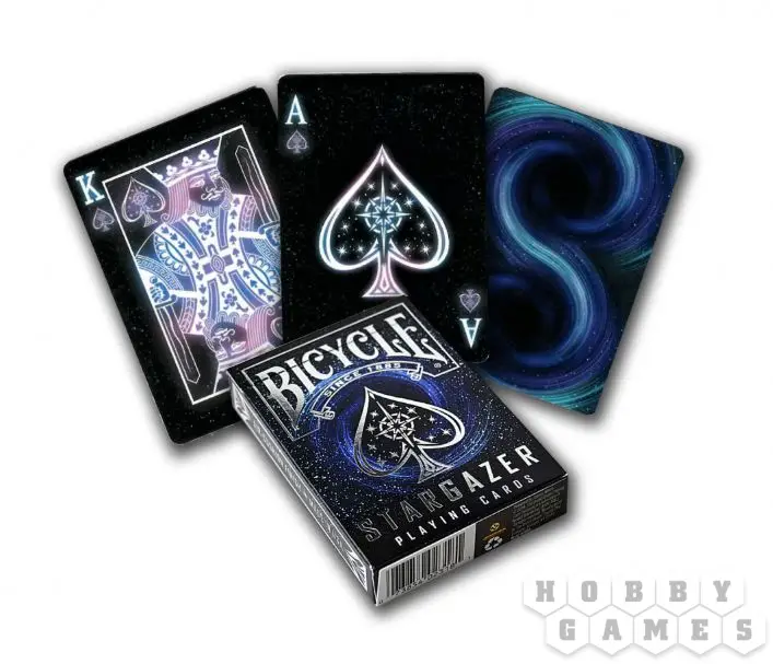 Карты Bicycle Stargazer имеют джокеров похожих на галактических путешественников, которые одной рукой приветствуют обладателя колоды, а во второй держит устройство, похожее на волшебный жезл со звездой на конце. По расцветке, джокеры с одной стороны очень похожи друг на друга, но если внимательнее присмотреться, то вы увидите, что они полностью отличаются — этот эффект достигнут при помощи инверсии цвета.