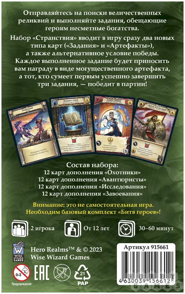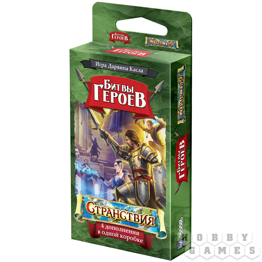 "Битвы героев: Странствия" включает в себя четыре минидополнения: наборы "Авантюристы" и "Охотники" включают в себя новые карты действий и защитников, а наборы "Завоевания" и "Исследования" добавляют 2 новых типа карт – задания и артефакты, – а также новое условие победы в игре! Перед началом партии раздайте каждому участнику 3 случайные карты задания, они хранятся в тайне от других игроков. Текст карты содержит определённое условие, удовлетворив которое вы можете выполнить задание, но не больше одного в свой ход. В награду за выполнение вы получите карту артефакта, которая даст вам несомненное преимущество! А тот, кто первым выполнит все свои задания, становится победителем.