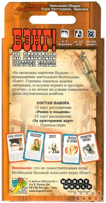 "Бэнг! На несколько карточек больше" – это небольшое дополнение для культовой настольной игры "Бэнг!". Теперь ковбои подвержены новым независимым событиям, которые уж точно повлияют на ход всей партии! Мёртвые восстают из могил, в город прибывает поезд, неупокоенные духи бродят по улицам, а в салунах играют в русскую рулетку.