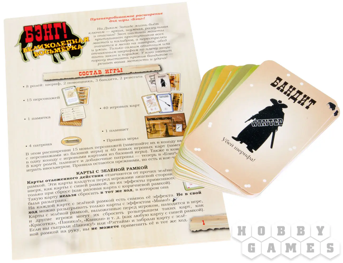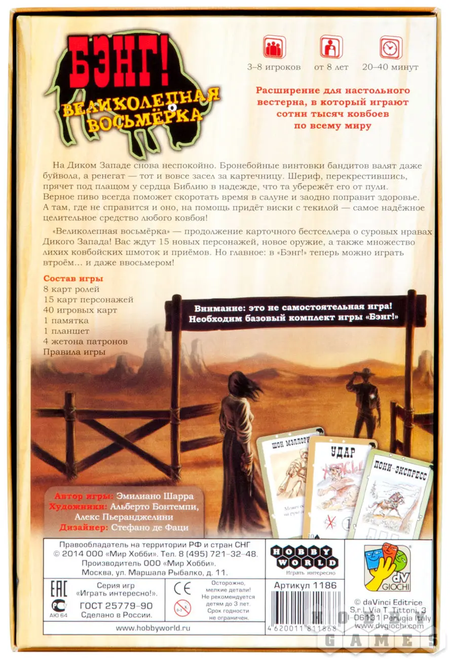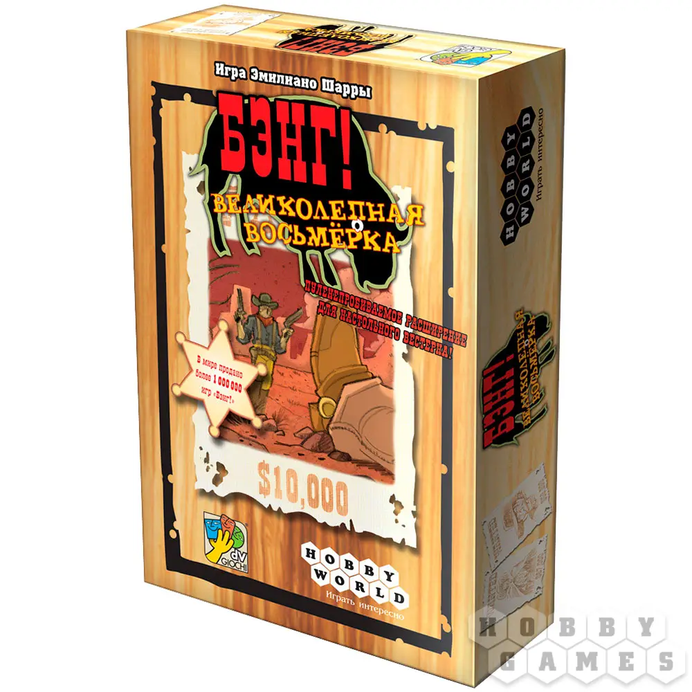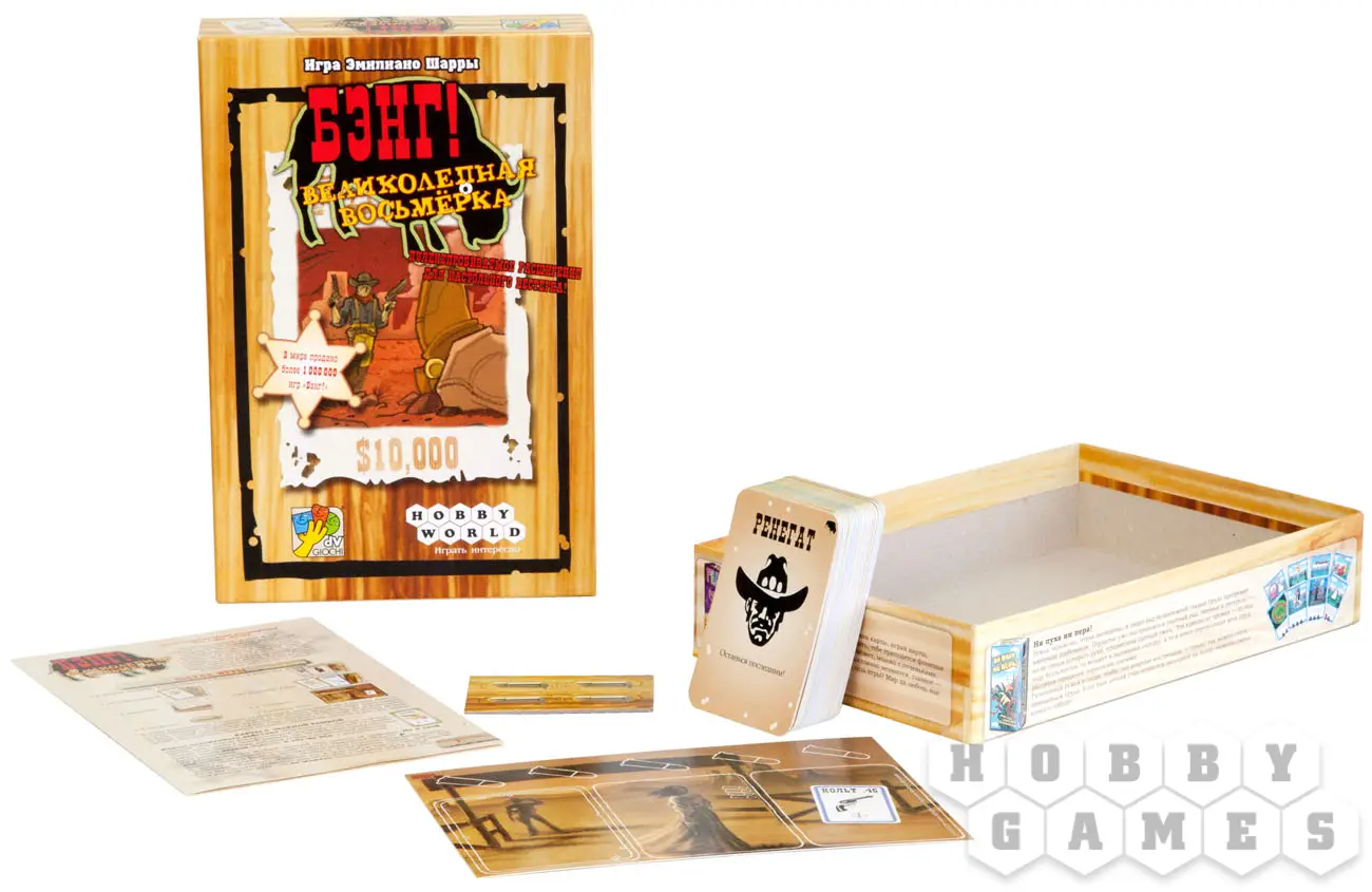 "Бэнг! Великолепная Восьмёрка" – расширение, которое значительно улучшит и разнообразит оригинальную базовую игру. Вы познакомитесь с 15 новыми персонажами и получите в своё распоряжение 40 игровых карт, но одним из главных нововведений, безусловно, является возможность игры ввосьмером!