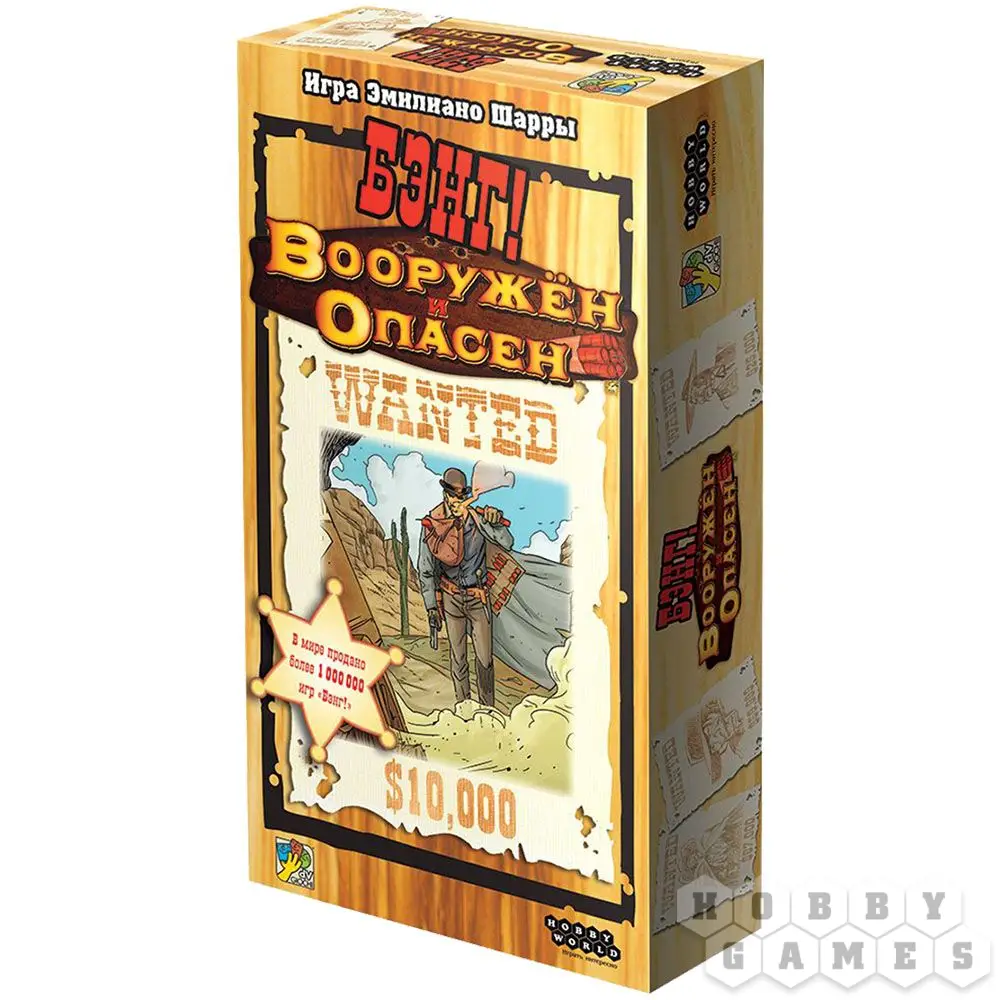"Вооружён и опасен" – долгожданное дополнение к карточному бестселлеру "Бэнг!", в котором появляются восемь новых персонажей. Они вооружены бескомпромиссными громовержцами, бьющими точно в цель двустволками и дальнобойными карабинами Шарпса. В колоде представлены новые карты улучшения в коричневой рамке, влияющие на исход игры. Они могут повысить уровень здоровья или усилить эффекты других карт. В дополнении сохраняются и старые карты, однако знакомые символы комбинируются иначе. Вам необходимо включить всё внимание, чтобы расшифровать потенциал каждой карты и остановить беззаконье!