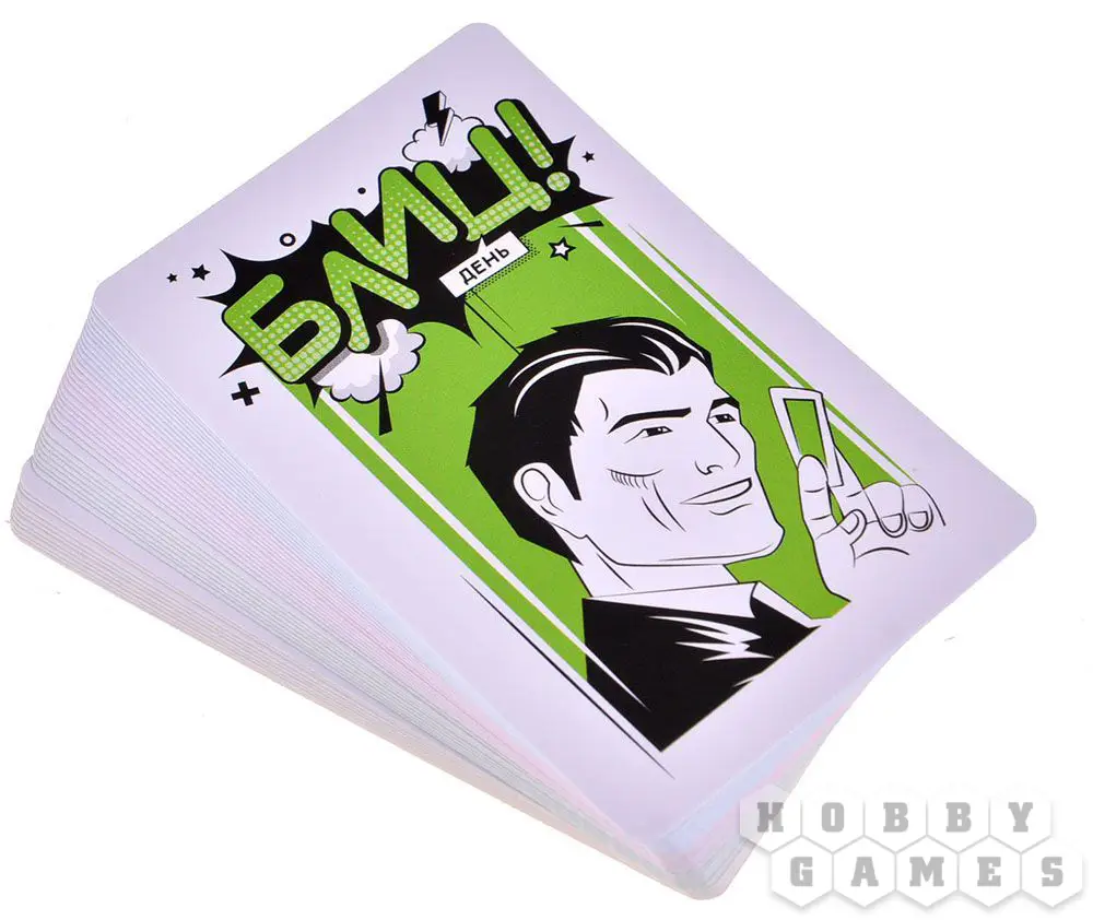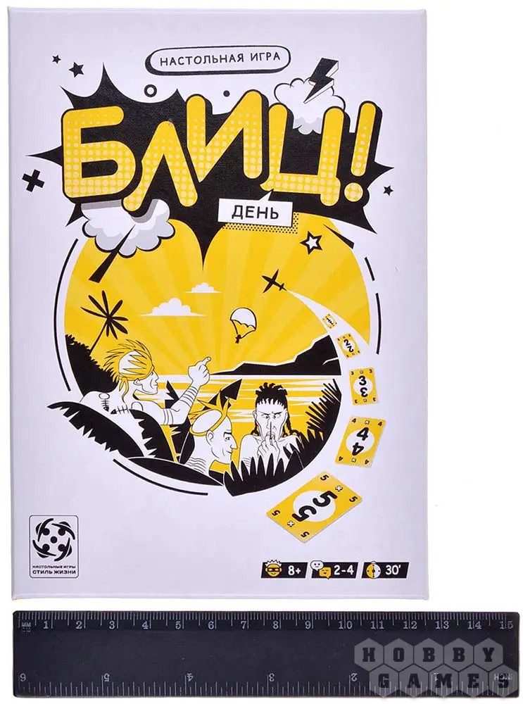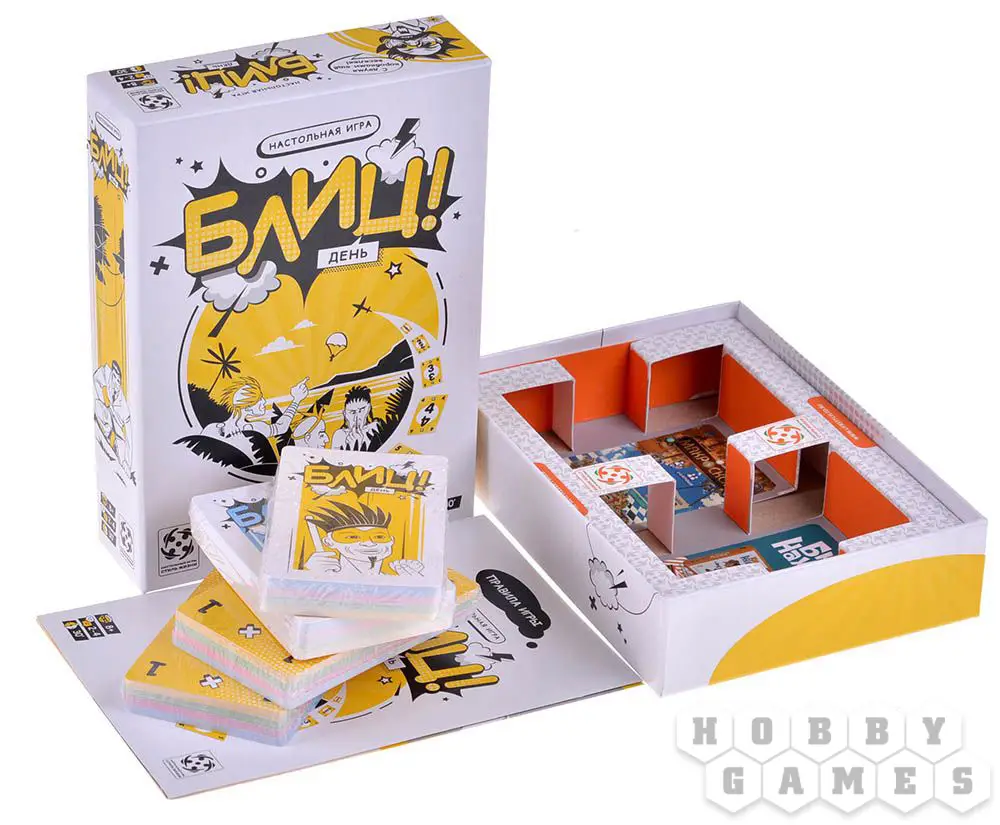 "Блиц: День" – это динамичная настольная игра для компании до 4 человек. Каждому игроку достаётся персональная колода, карты из которой он будет выкладывать в реальном времени: в "Блице" нет очерёдности ходов, все играют одновременно!
