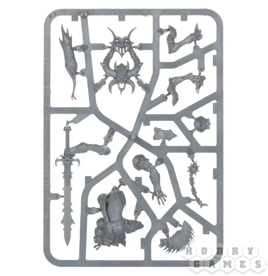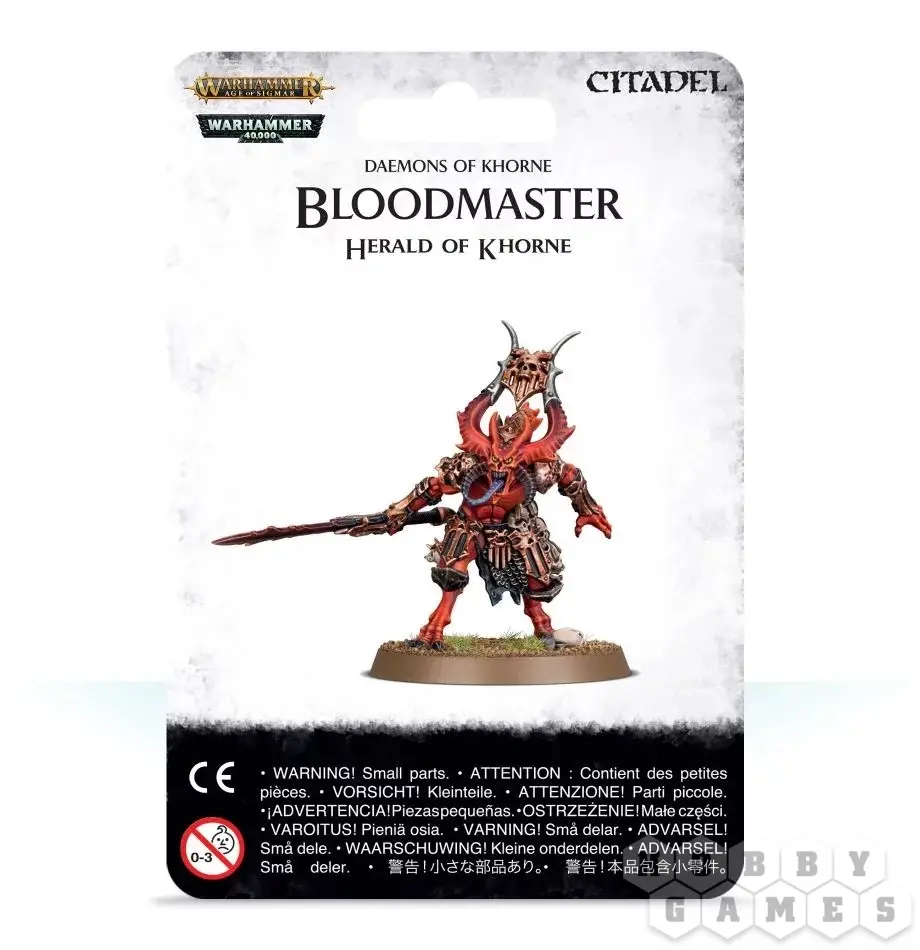 В этом наборе вы найдёте круглую подставку диаметром 40мм и 14 пластиковых деталей, из которых можно собрать одну миниатюру Мастера крови, Геральда Кхорна (Bloodmaster, Herald of Khorne). Его облик похож на внешний вид Кровопускателей, но Мастер крови больше и носит дополнительную броню. Эта миниатюра будет отлично смотреться в передних рядах вашей армии Хаоса.