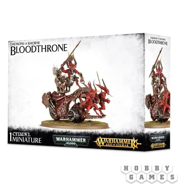 Кровавый трон - демоническая машина, отголосок Трона Черепов, на котором восседает сам Кхорн. Украшенная симолами Царства Крови, напичканная механикой, она оснащена колесами, размалывающими под собой все на своем пути.